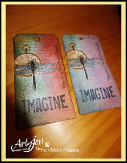 1. First I stamped the dragonfly from insects and butterflies 1.....(I love him dearly ;))....in Distress Ink black soot and heat embossed him with holographic powder then I coloured the wings with Distress Ink faded jeans using a cut and dry nib.....masked him and stamped the watch from time and keys in Archival black then coloured the casing with Distress Ink rusty hinge.......and masked that too.....then I inked the two tags with Distress Ink pine needles and aged mahogany....so far so much the same!