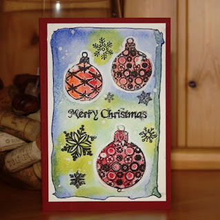 First, stamp your baubles, snowflakes, trees and greetings from the Christmas stamp plates on to a watercolor paper with Archival black ink.