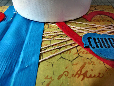 I also painted two little hearts from my stash in red before stamping over the top with the Chicken Wire background stamp. When everything was dry I wrapped some string around the covers and glued the hearts into place.