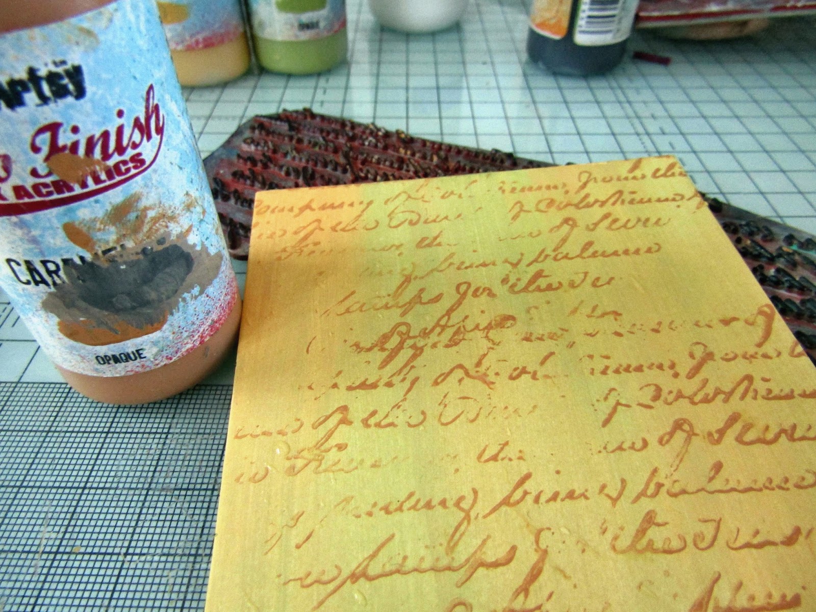 Over the top, I stamped a calligraphy mat with caramel paint, When I stamp I try to roll the stamp from one side to the other so I get an incomplete print.