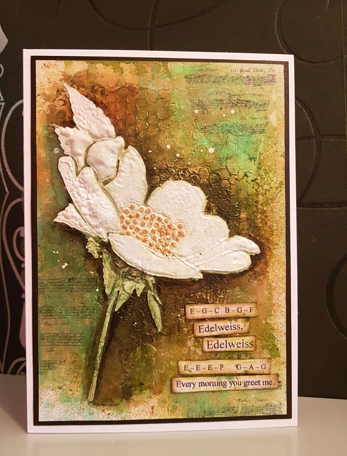 My favourite movie by far is The Sound Of Music!!. I have it on DVD, but I still have to watch it when it comes on TV, so as this months challenge is all about "music", then obviously I have to interpret a song from that film. Yes....I can hear you groaning, heck, she is using that stencil again!!!....but I just love it, so I'm not gonna apologise for it!!!. I have used the DOG ROSE stencil to interpret the edelweiss...yes, give me a bit of poetic licence!!!..but it also shows how versatile that stencil is!!. I have also used the SEQUIN WASTE OPEN stamp to add a bit of texture in the background by scraping a small amount of texture paste on my card and stamping the sequin waste stamp into it.