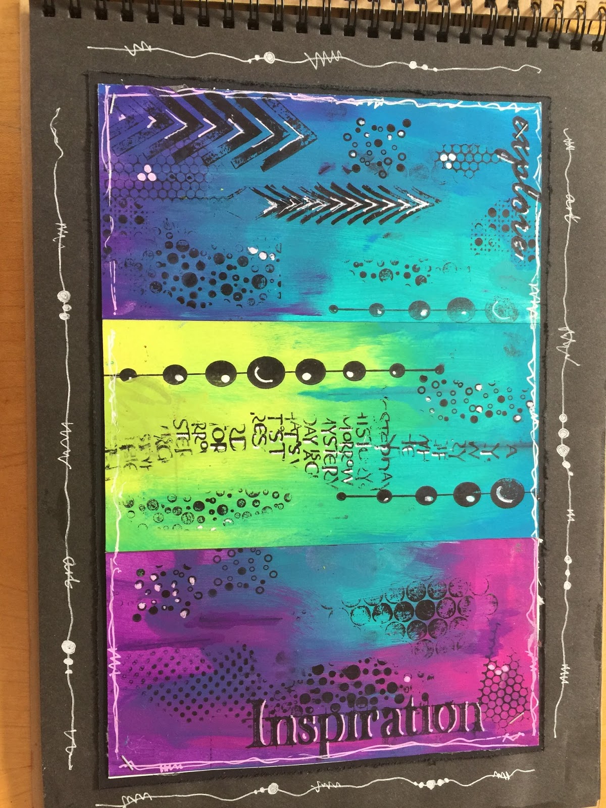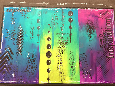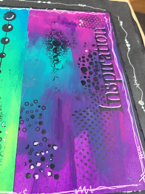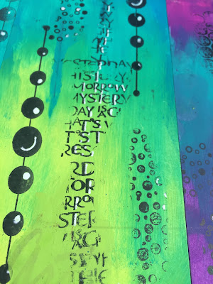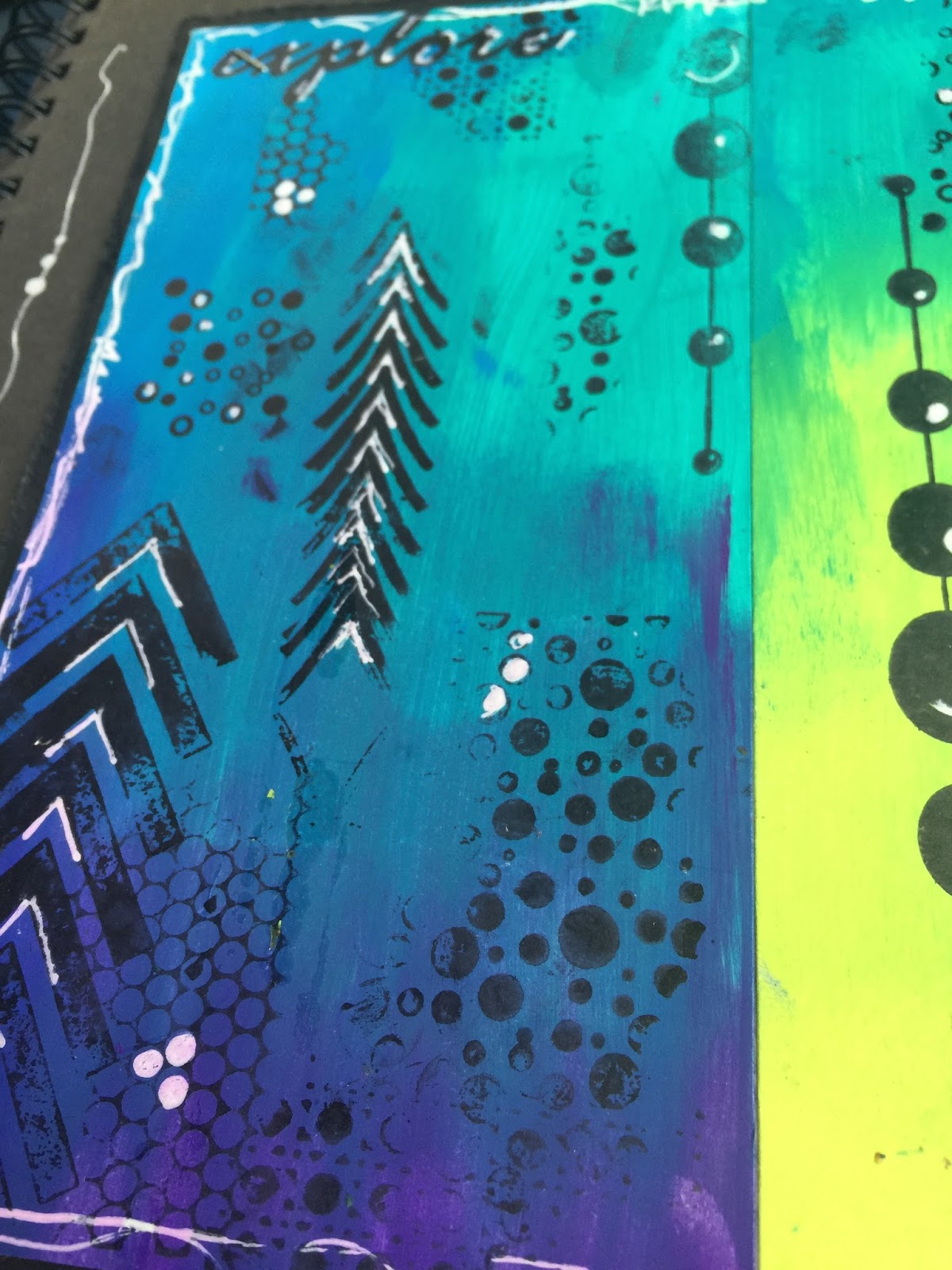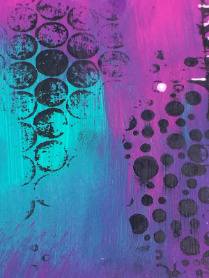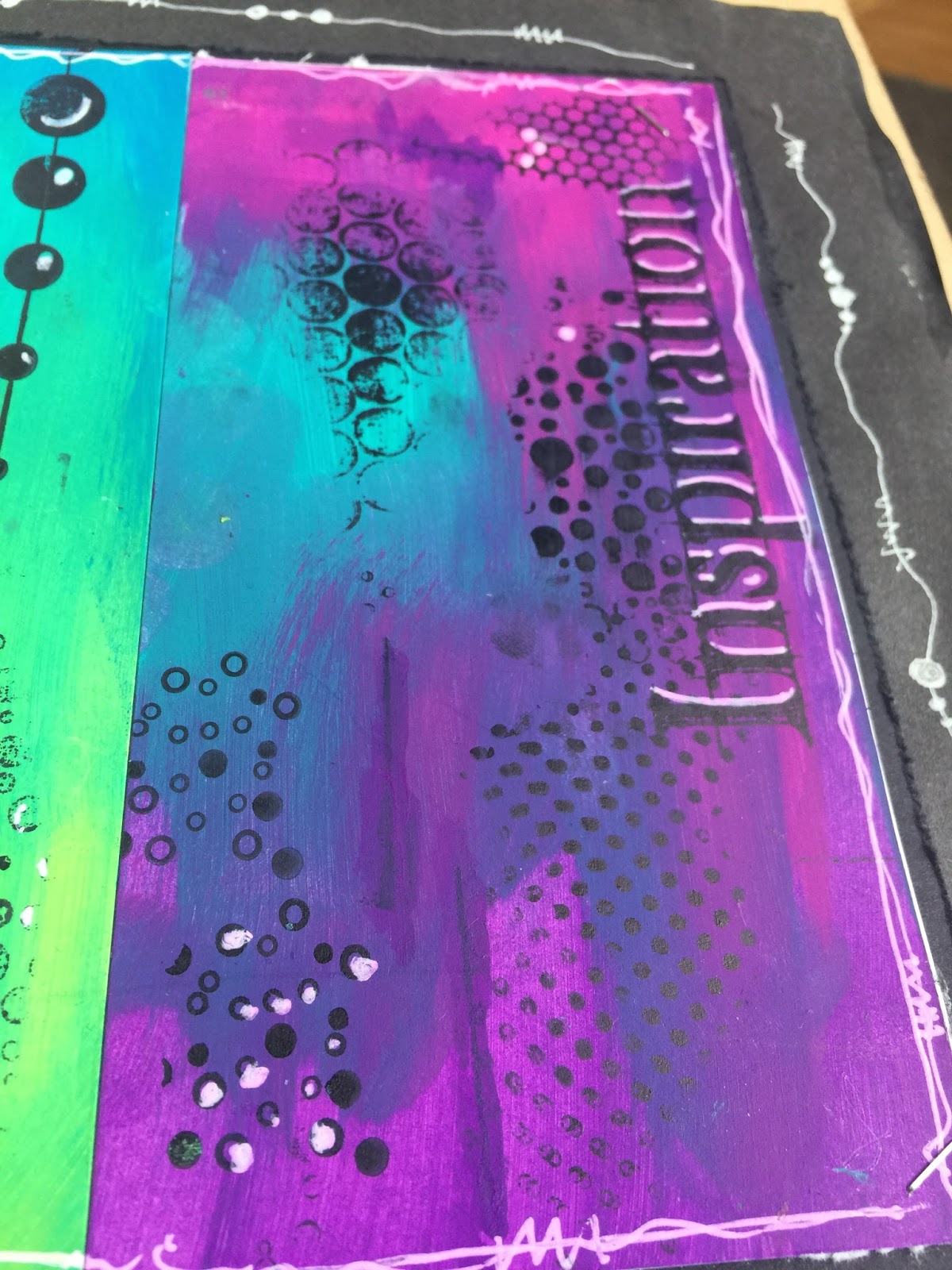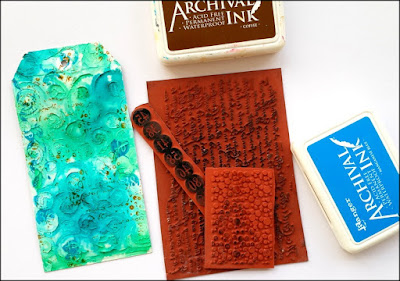 Here is the how-to : just ink your mat with your Distress ink pads, spray water and press your paper on it. Then ink some mini background stamps with the same inks, stamp it here and there, and then stamp this awesome door with black archival ink.