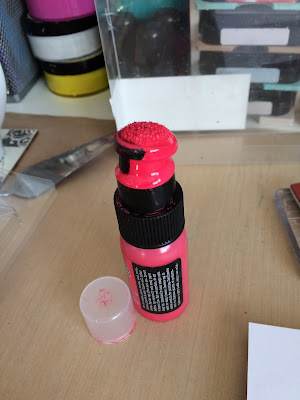 I started off doing some printing with my gelli plate, and this is when the fun started I decided to use Distress Paints so out came all of my reds. Candied Apple made its appearance first with a nice couple of squiggles on the plate, next came Barn Door and this lovely little container of paint usually works with a gently squeeze to get some extra paint out! This is what happened when the gentle squeeze didn't work