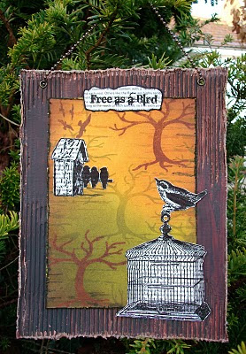 Free as a Bird, onto book pages with black ink. I used pages from a book on birds to keep up the theme, but any will do. Tear around the phrase, and ink the edges with black. Cut out the other images.