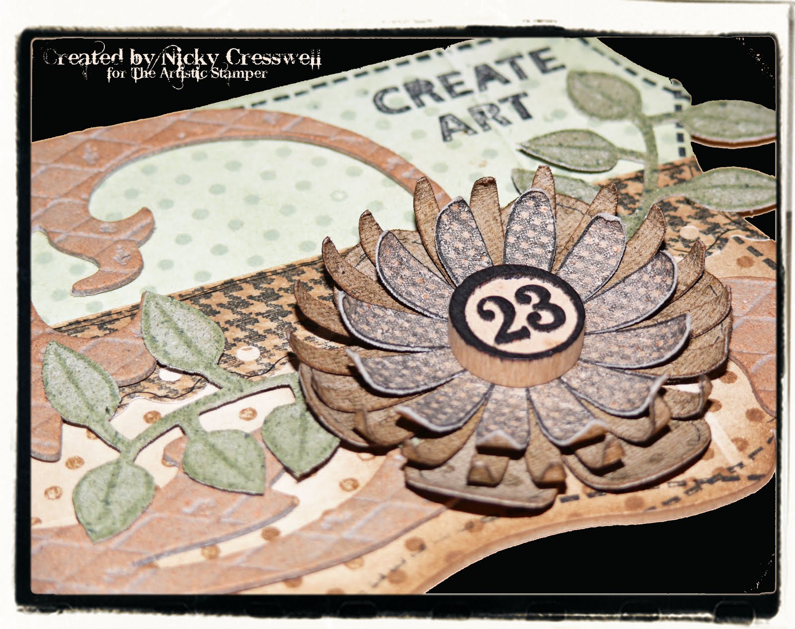 All that was left to finish up was to stamp 'create art' using the sentiment from the flower bloom set {missing out the blooming from the stamp by just inking each word at a time, you could of course cut the sentiment into 3 to give you more freedom with placement} and there you have it, my copycat Wendy Vecchi piece.
