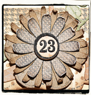 To make the flower i stamped the largest of the flower power and the 2 largest of the flower fever sets onto grungepaper, I roughly cut round each one, gave it some brushed corduroy ink, then stamped with a different background, I used dots & gingham, but the possibilities for these are endless. I cut each one out and curled the edges. {I did the foliage in the same way, stamp, ink, cut out.}