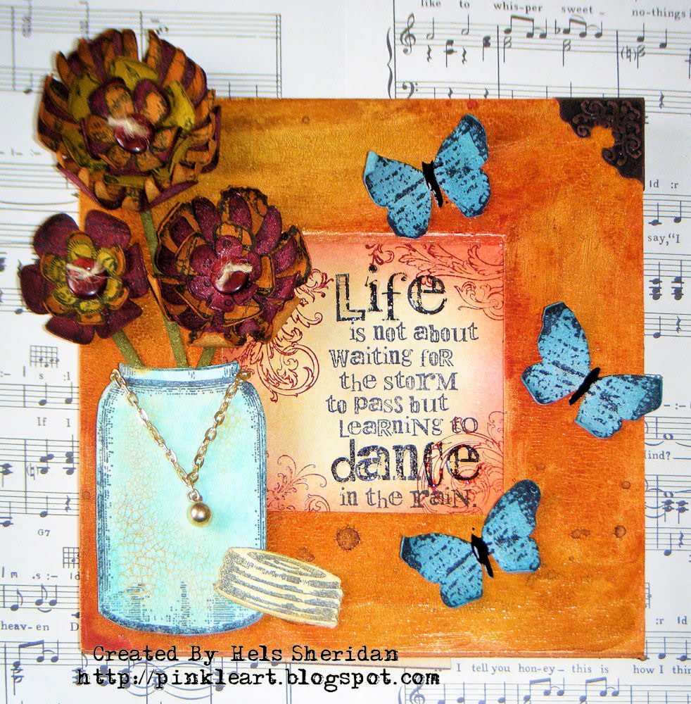 The flowers are made from Flower Power, Flower Fever and the new Flower Blooms plates, stamped onto Grungepaper and coloured with Distress Inks, then I used some backgrounds to overstamp a pattern onto them. They were then all curled up and stuck together with some little strips of Grungepaper behind them to make stems.. then popped into the bottle.