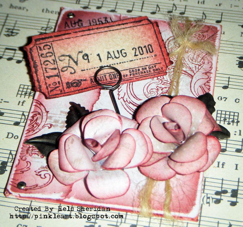 So these old paper roses are as addictive as the ATC's they are being made for. I can't tell you how much I lurve the Tim Holtz papers... well, I could tell you but I would be here for yonks, extolling the virtues of the patterns, colours, quality etc...see, I am off again *even over here I have no control over my wafflings ROFL* Anyways, the roses were made with the medium sized flower from the Flower Power set (note a pattern of addiction emerging here?) I stamped them onto the ickle 2" square bits of the papers... cut them out, assembled them into roses... and cos this paper is soooo lush, it stays curled! I used the Vintage Shabby stack for this first one... adding some ATC sized paper onto mountboard... using Idea-ology Foliage behind the roses, tying some Jute around the ATC, using the Mini Brads for the corners, using my old date stamp... a couple of Tim stamps in Aged Mahogany and colouring the edges with this... and some Pumice Stone...these DI's were made to go together weren't they? The ticket..erm... is a new one, from the 100th collection.. which should be here by early October... we will keep you posted about that though... erm, my ticket stamp is from the gold signed 100th collection... oh, I mentioned that before did I?? ROFL