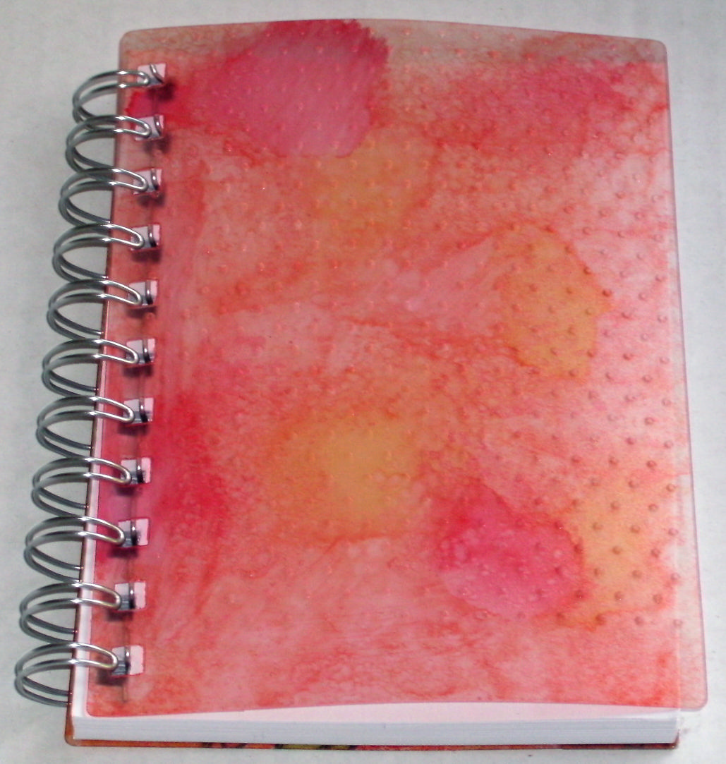 1. Open out the cover and apply the alcohol inks to the reverse: add a couple of drops each of the Orange, Red Pepper, Yellow, Watermelon, and Pink, so that they are not touching each other on the felt applicator pad. Dab, moving the direction of the tool around as you go. Then add a couple of drops of the blending solution to the tool and do the same again. I kept checking by closing the book again so I could see the colours reflected against the white background, until I was happy with the intensity of the colours, so you may want to apply more. Apply colour to the back cover in the same way. I've shown a picture here of the back cover with alcohol inks on and I also took the cover off and popped it through the Cuttlebug Swiss Dots folder, which is another thing you could experiment with!
