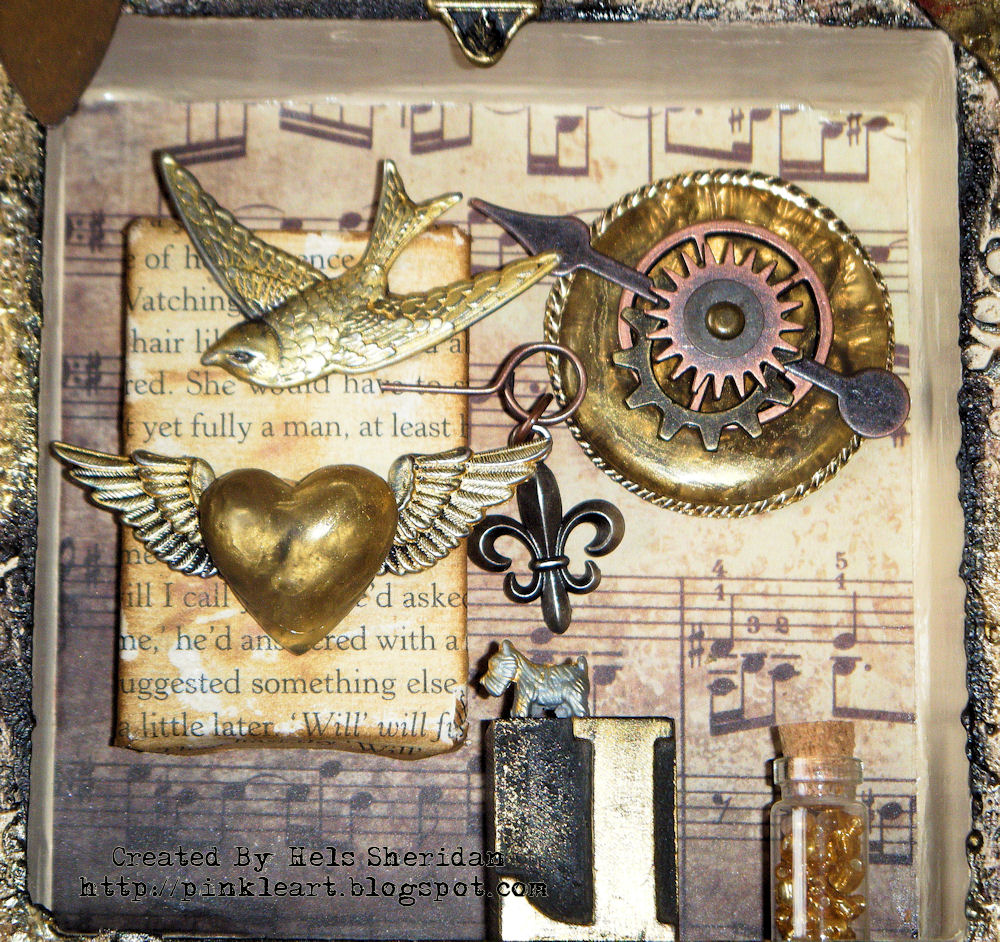 The inside of the box had had the sides painted with Trad Tan... and I added a little piece of paper from the Lost & Found stack (out of stock at the mo but back in soon) and then covered a mini canvas with an old bookpage and added colour to this. The little L is from my stash, as is the little Monopoly doggy... he came from a travel set I got in a pound shop... for... erm... a pound ROFL I heated up some UTEE in my Melt Pot, a lashing of clear and two little puddles of gold... then once it was melted, I inked the coggy stamp with clear embossing ink, poured the UTEE over it in a swirly motion, this means that the UTEE has like an agate look to it... I let this cool and then broke the UTEE into bits and added some gold and black to it to define the cogs. The little heart was made using a mould I had made with Mold n Pour... the other little hearts were made by pouring UTEE in a swirly motion again onto a craft sheet and then popping cookie cutters into the still molten UTEE. Finally, the little embellie in the recess... is a clock stamped onto Gold Nugget TSS Metal... scootched around the edges and I have a cookie cutter which is almost the right size... so I popped a bit of clear emb. ink around the rim to act as a release, set this over the metal piece, then poured the UTEE into the cookie cutter... not too much otherwise it would be too thick... *bit like me LOL* To embellish, I added Idea-ololgy - the Ornate Plate has an Adage Ticket in it, which was then filled with Rock Candy Cracklepaint.