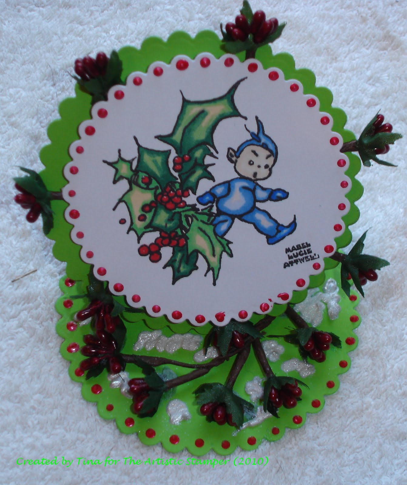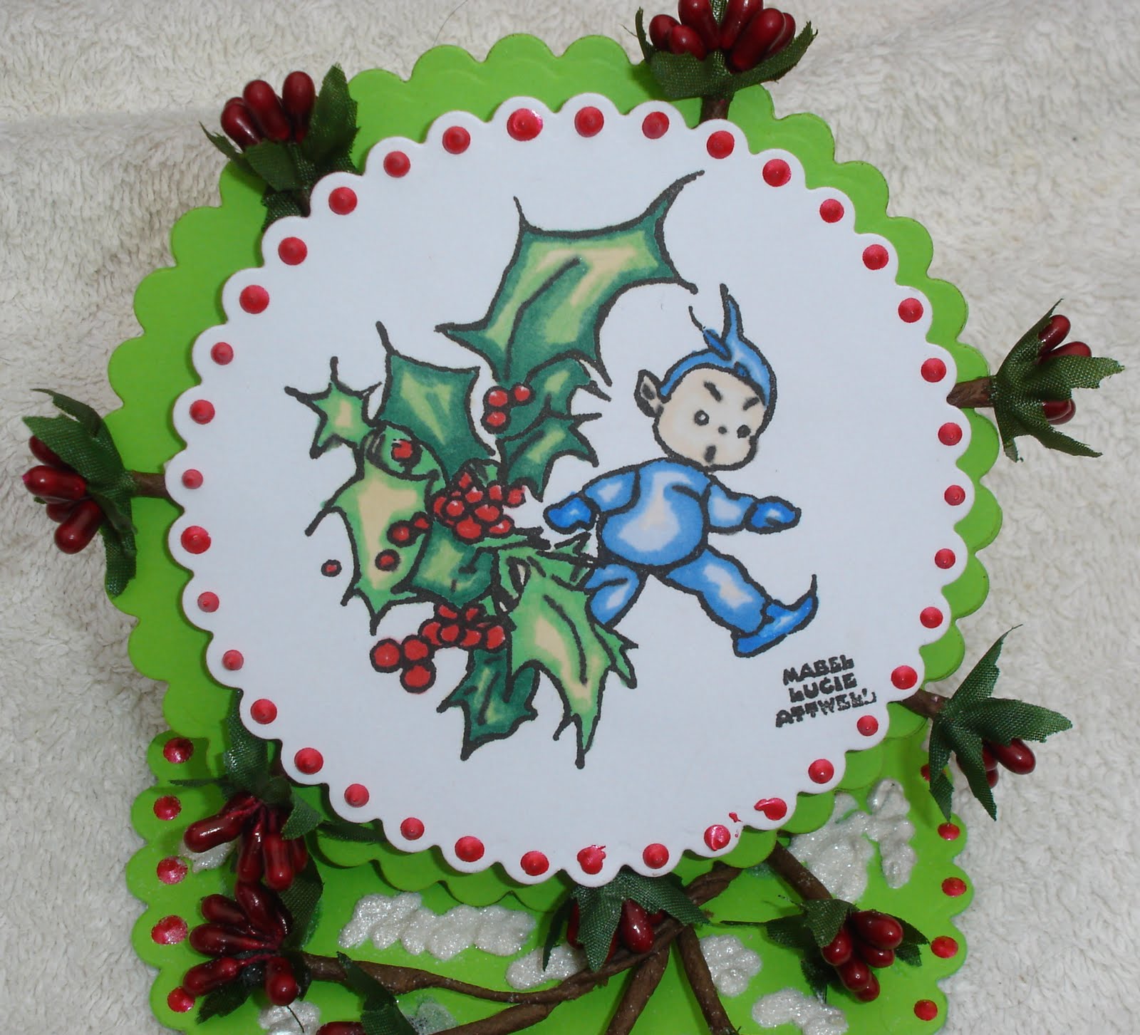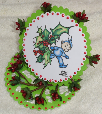 Now because they are quite hard to glue down I had to use silicone glue, this could then be seen so I have used some "Fluffy stuff" to go around the berries to look like snow and sprinkled some glitter to look like the snow is shimmering!