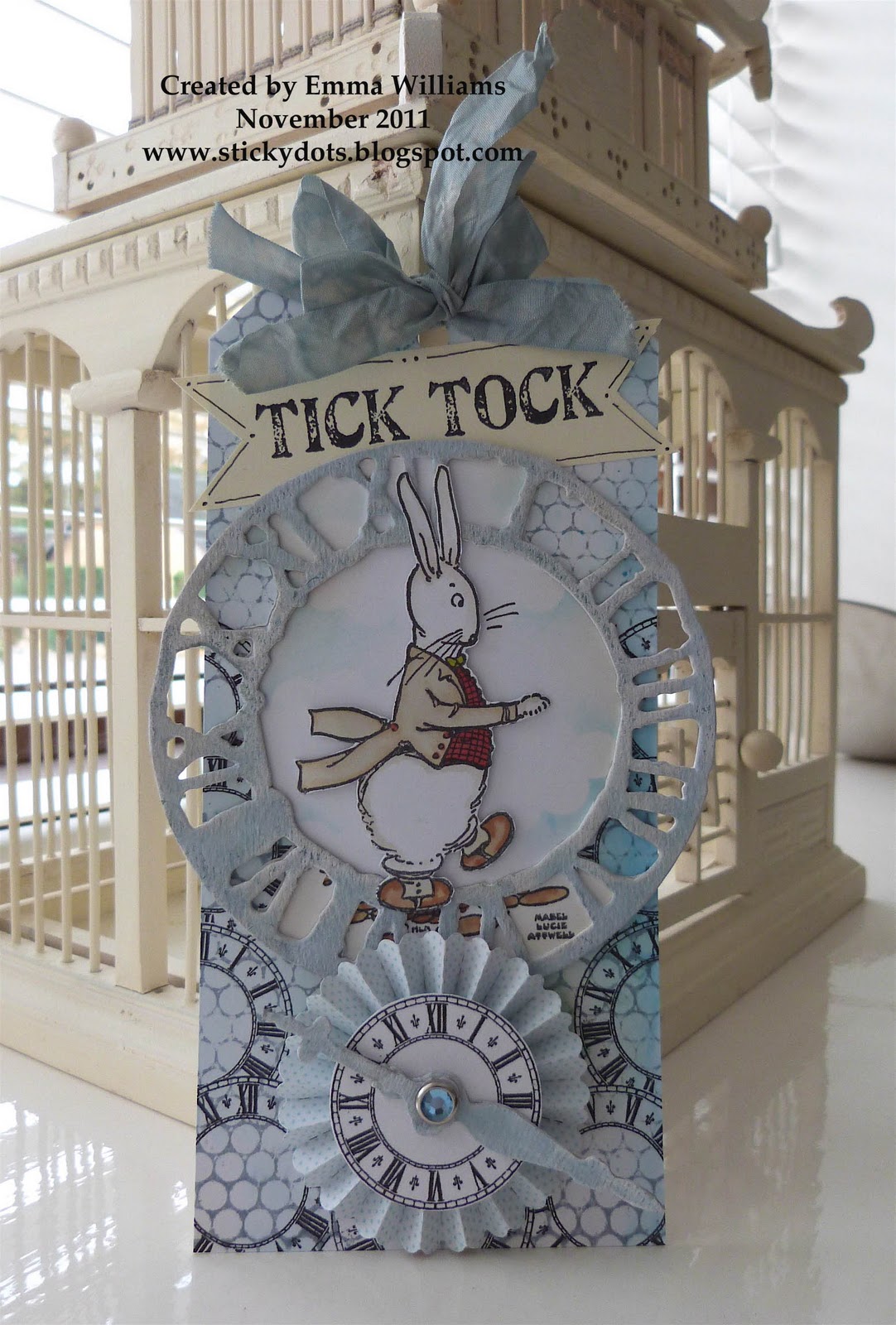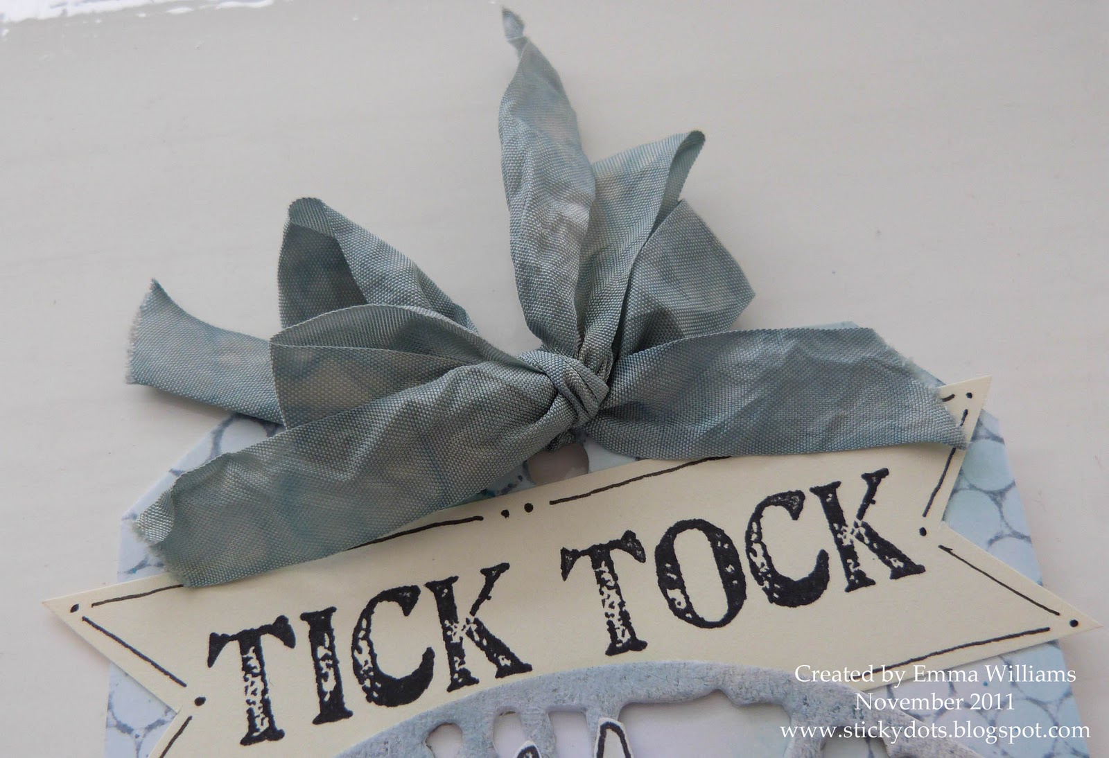 I inked up the "Tick Tock' wording from the Tick Tock stamp sheet with Black Archival Ink and stamped onto cream card, trimmed each of the edges to give a banner shape and then added it to the top of my tag.