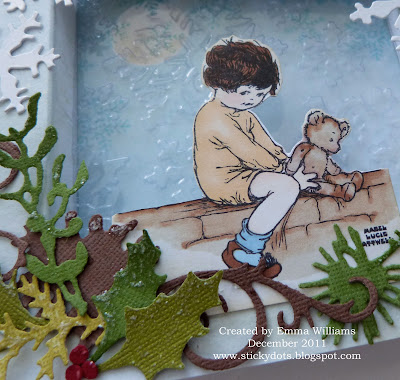 Next, using Tim Holtz's Decorative Strip die, I die cut the Festive Greenery from various colours of Ranger Distress Core'dinations paper stack, sandpapered each piece and then arranged and stuck them to the base of my shadow card, together with the stamped and coloured Mabel Lucie Attwell image, which now stands in the foreground of the card, to give a three dimensional look.