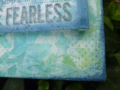 Love what you are doing with acetate! This piece is also really cool! Love the textured background and the colors you've used. So pretty. That Faded Jeans Embossing Powder really looks fantastic on the edges. Really pretty piece! <3 Candy