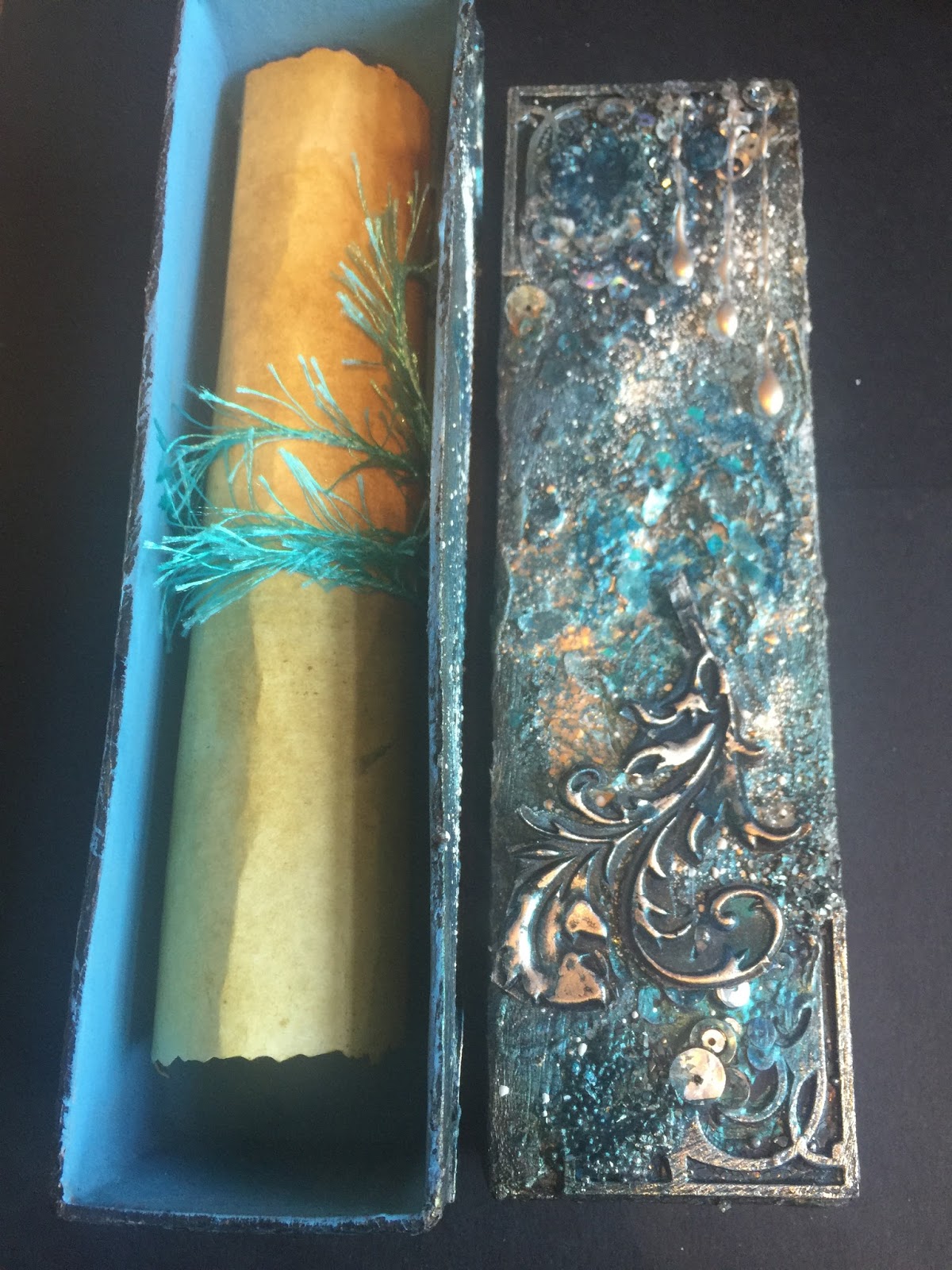 I ripped up some book paper, glassine paper and tin foil that I had run through an embossing folder, and glued them onto a plain manilla tag.