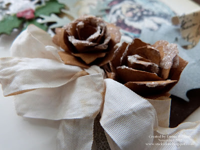 I used one of the little wooden arches from HERE. I decorated it with paint effects; sky blue (toned down with a little white) for the undercoat and blank canvas white for the top coat), sanded it then stamped it using some christmas stamps from HERE... snowflakes, "silent night" and the little winter scene... I have also used some of the trimming from the Tim Holtz collection by cutting off four or five individual roses from it.