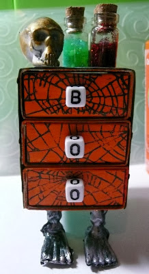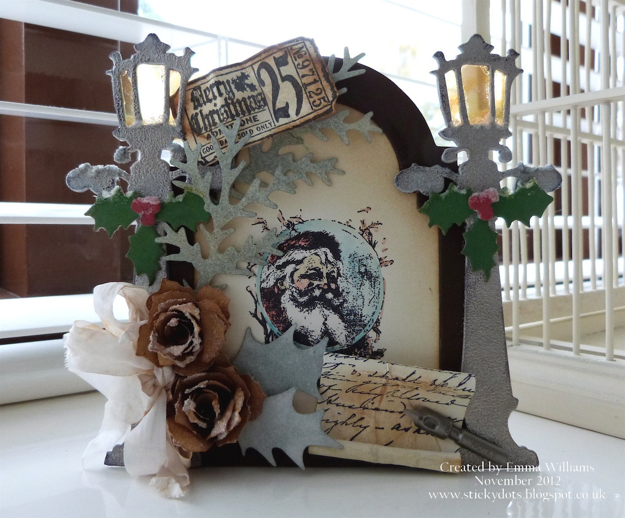 I used one of the wooden houses in the "altered art" section of the shop. I painted it inside and out with a combination of duck egg blue and cream. then i stamped some christmas images (list at the foot of the page) on to tissue paper i had pre-stained (and dried) with antique linen distress stains. i cut them out and glued them to the back of some of the compartments of the wee house. I then painted the "floors" of the compartments with white paint and added some snow-tex (fake snow texture). after that it was a case of filling in the wee compartments. making snowballs out of beads and using a lot of Tim Holz and other sizzix dies.