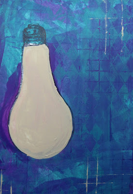Keeping the mask in place I stamped both the Grid and Harlequin Background stamps in the same colour paints. Then I removed the mask, and stamped the light bulb. Then I painted it with a titan buff acrylic paint. I also added a little titan buff to the background with the edge of a card.