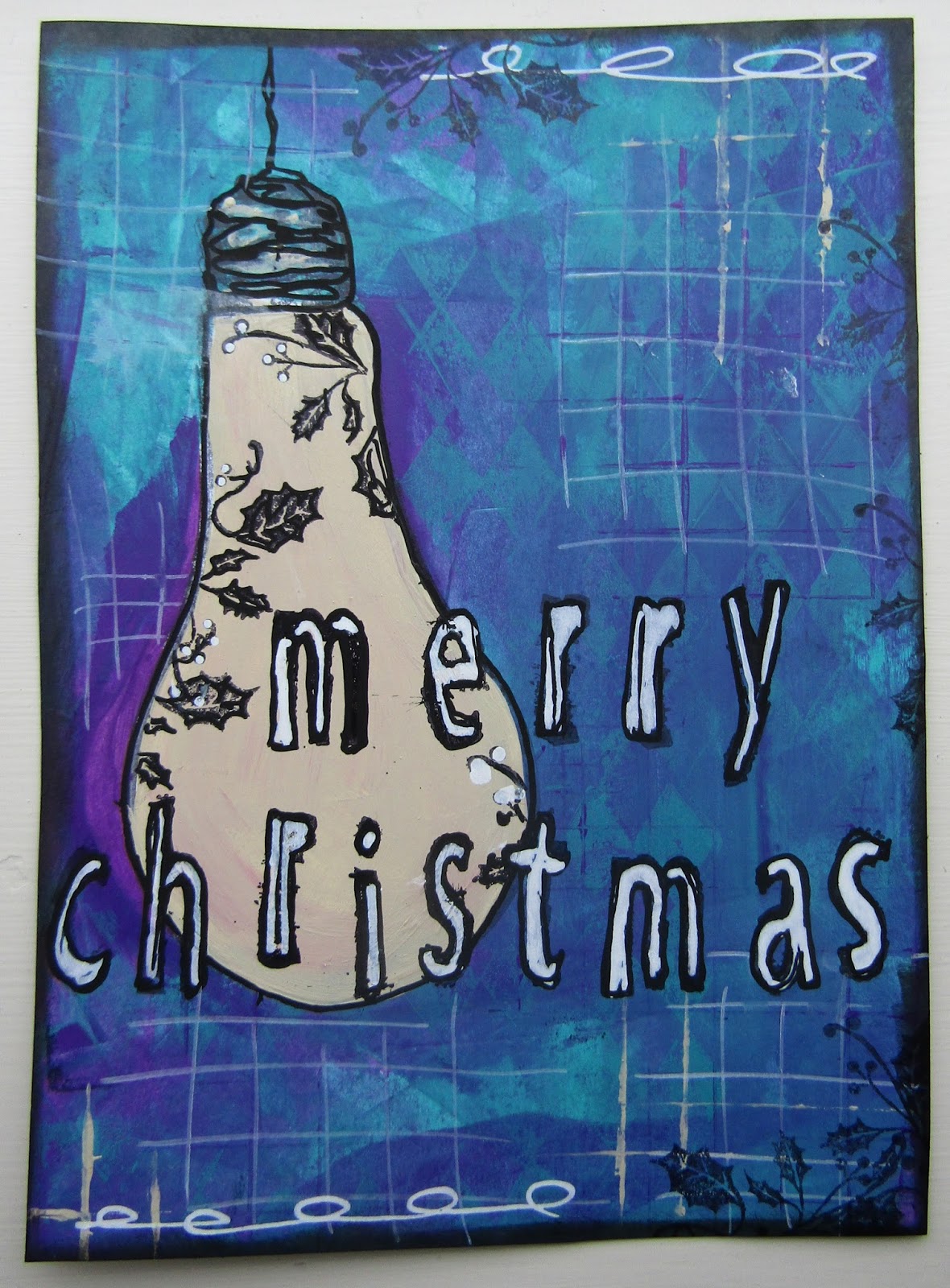 I stamped Merry Christmas using the decay alphabet , which I went over with both black and white paint pens. I also stamped a little holly stamp in the light bulb and around the edges of the card. To finished I drew around the light bulb with the black paint pen and added some white in places with the white paint pen.