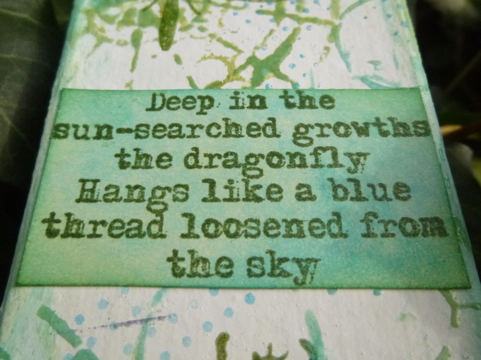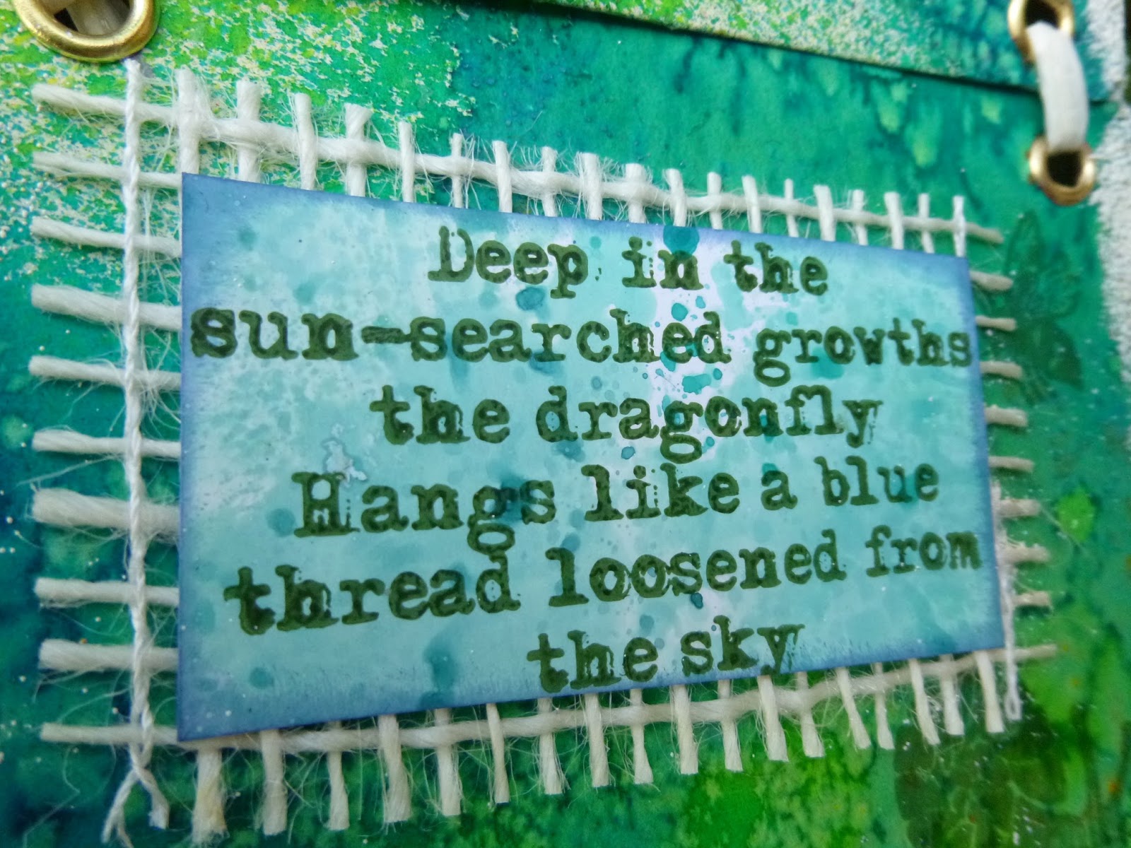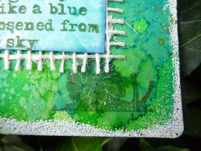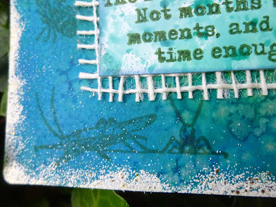 The quote - by Rabindranath Tagore - has long been one of my favourites. I stamped it on a separate piece of glossy card, that I'd used to mop up some ink at some point, and which toned in rather well with the salty background. And then I mounted it on some cream mesh to give it a bit of extra definition.