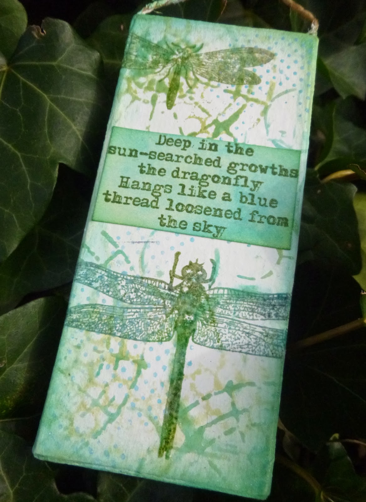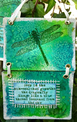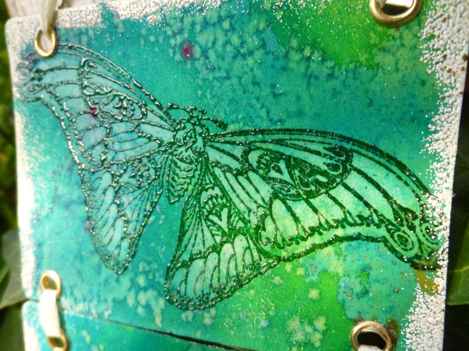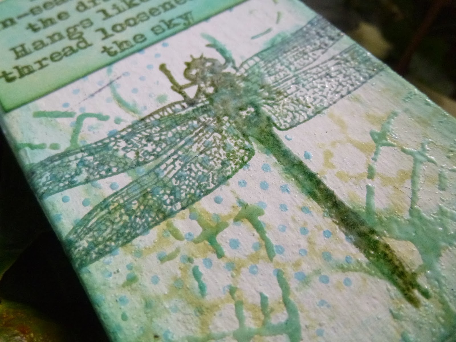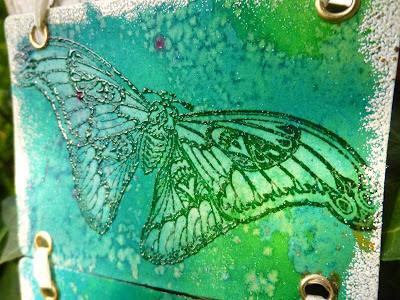 I used a water brush and some paper towel to lift some of the Dylusions colour away from within the wings, just to make them stand out a little more from the background.