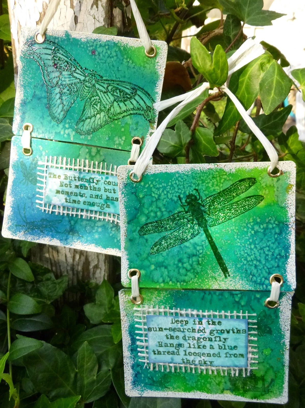 Hello all, Alison (butterfly) here with a pair of tiny hangings offering a fleeting glimpse of the creatures I'm sure are at least partly responsible for all the faerie mythology down the ages (though obviously there are real faeries to be found too, if you look hard enough).