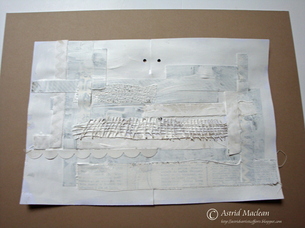 Next I prepared my pages. I laid 2 pages from my Mixed Media journal side by side and covered them with random strips of paper, ripped canvas and other textural bits.