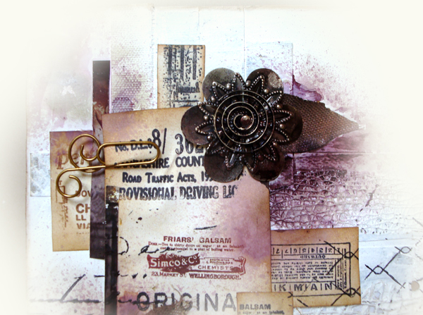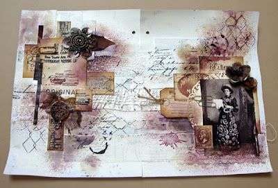 After that I started to arrange my ephemera over and around it until I was happy with the composition. At that point I should have taken another photo but forgot.... So I'll talk you through the next stages. I glued my ephemera down over and around my photo which I had trimmed a little first. I added a few embellishments from my stash and then created a home made spray with a mix of