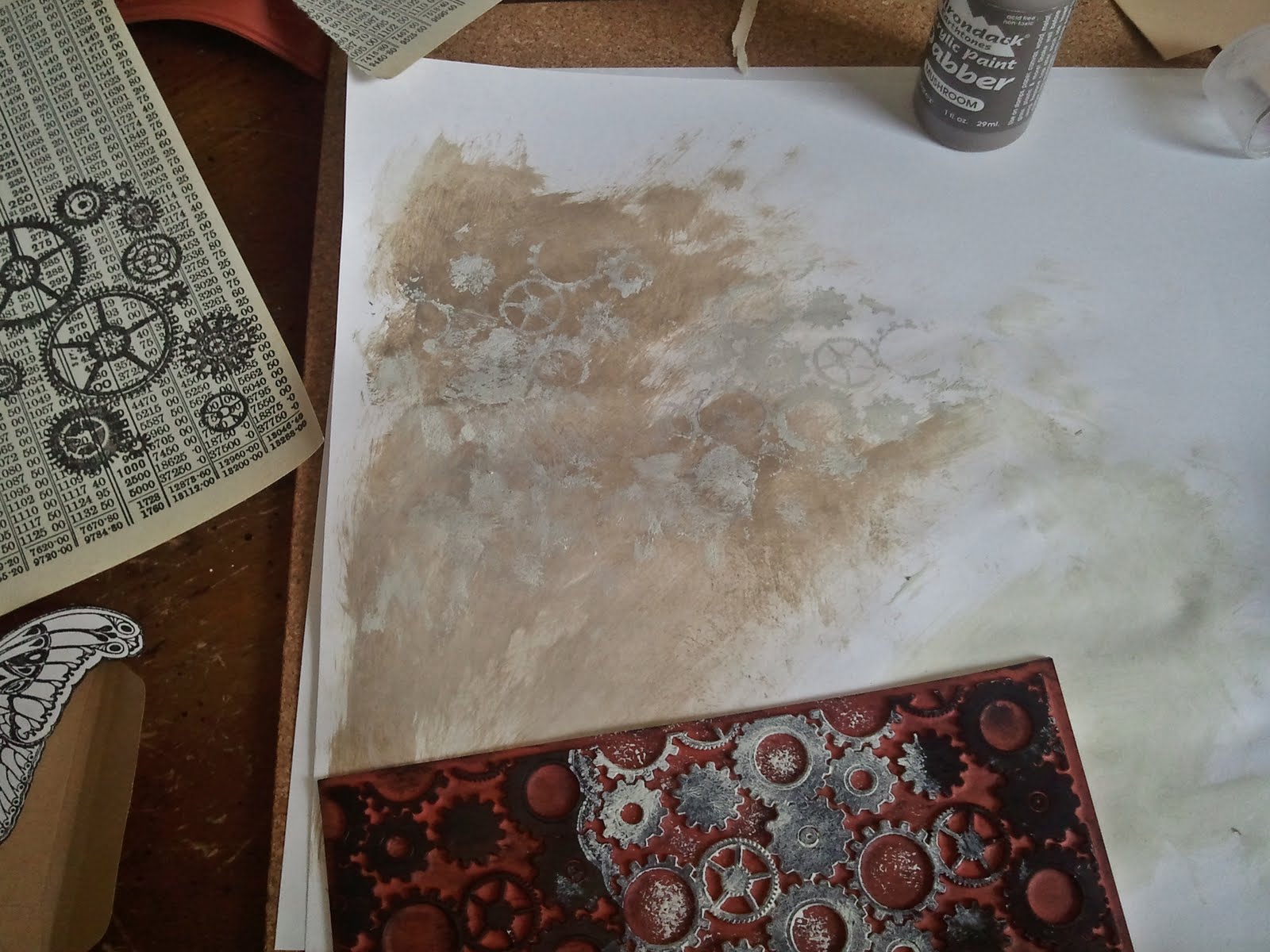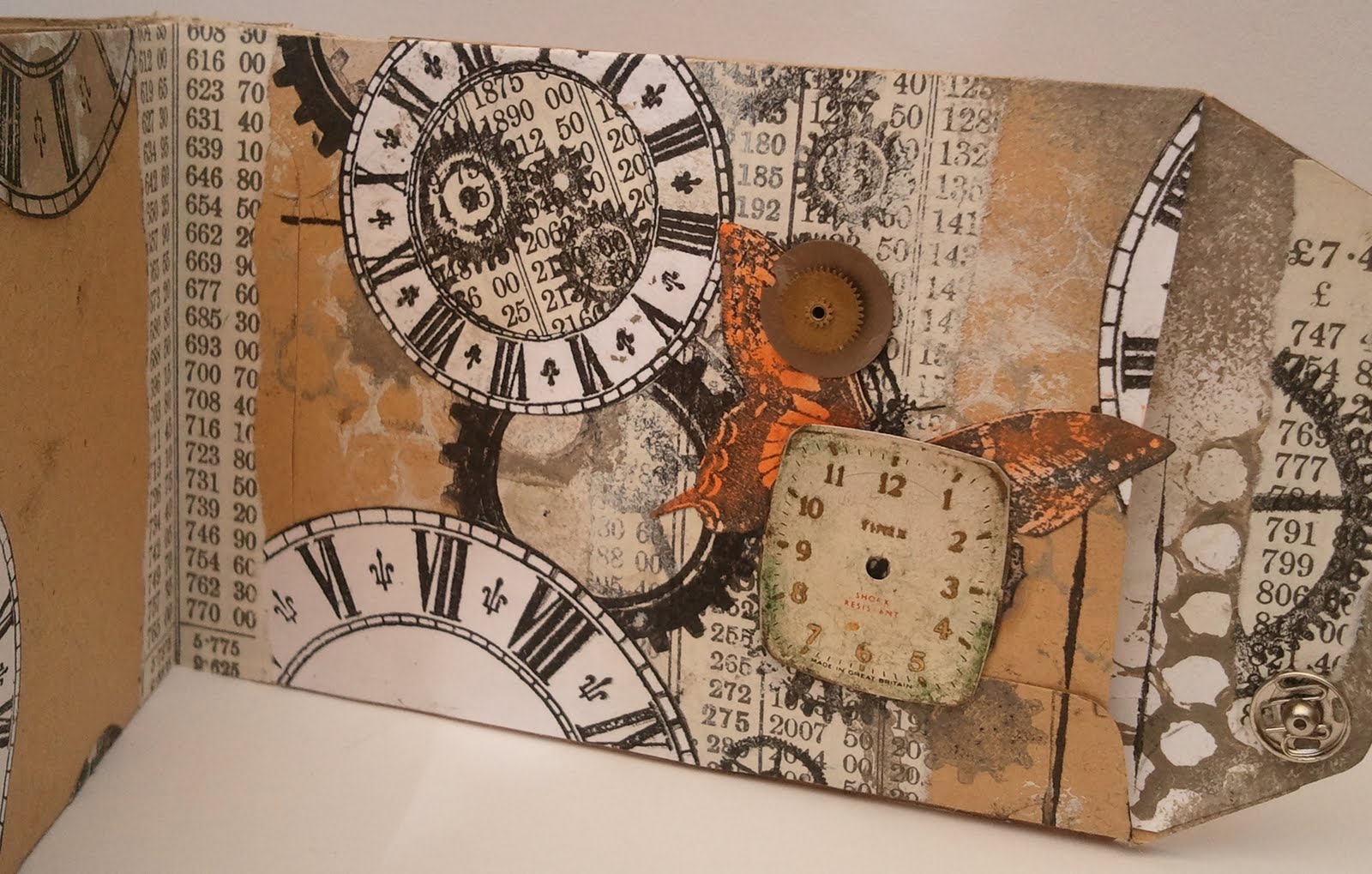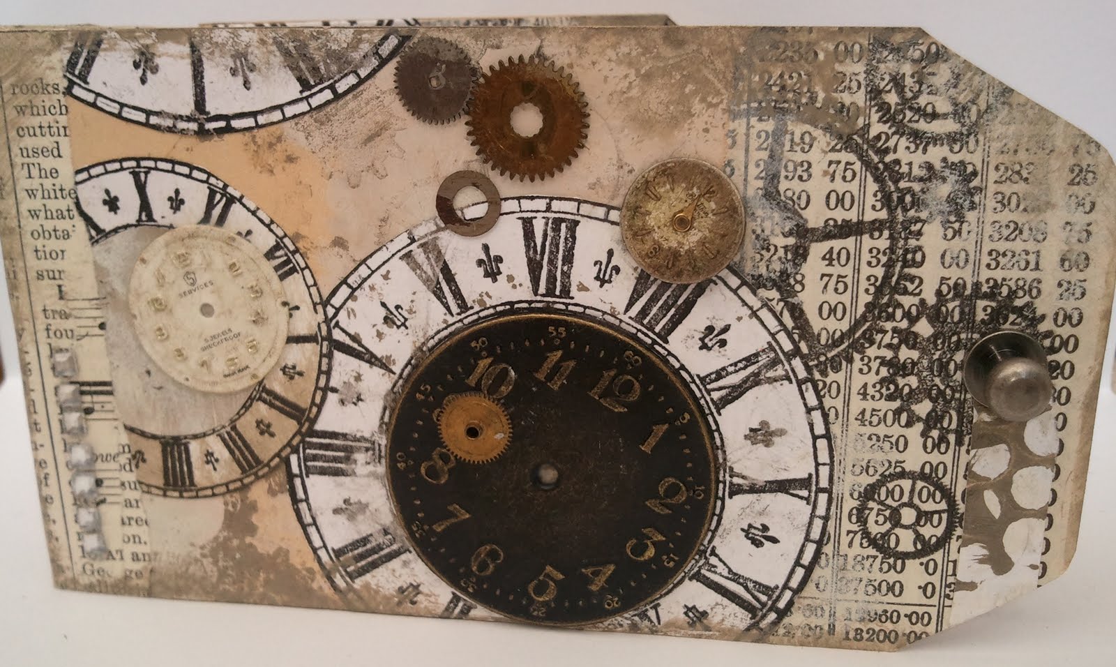 I painted the background using emulsion paint, masking some areas with Tim Holtz' cogs mask, and adding stamped elements with my Rusty Hinge distress ink pad and the wonderful cogs background alongside elements from Tick Tock.
