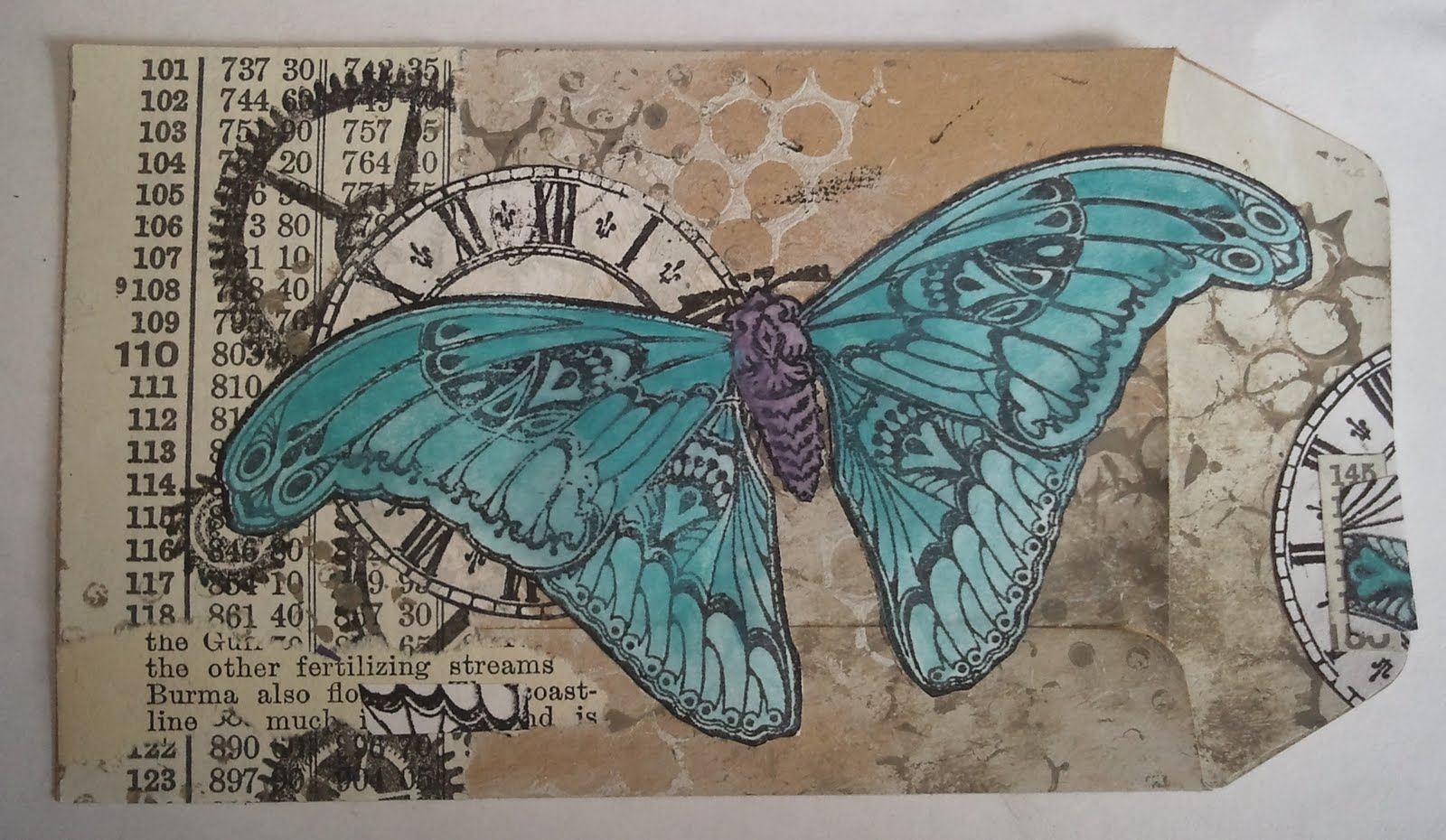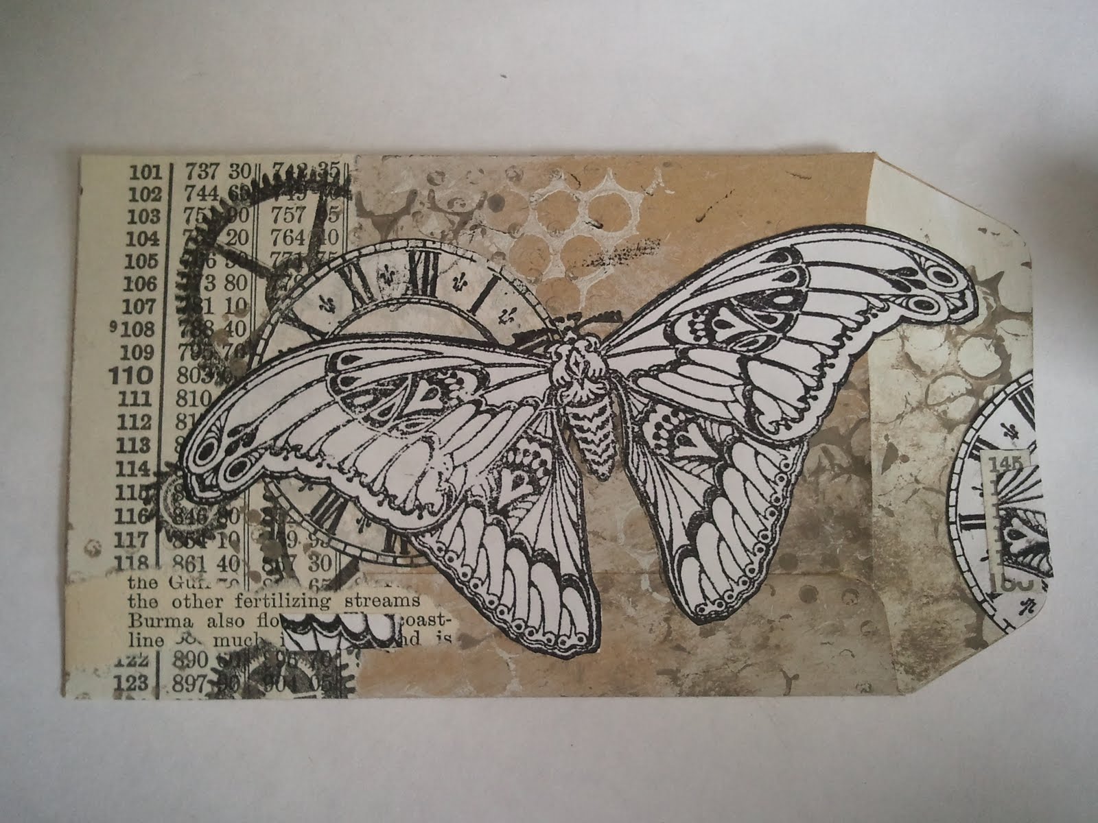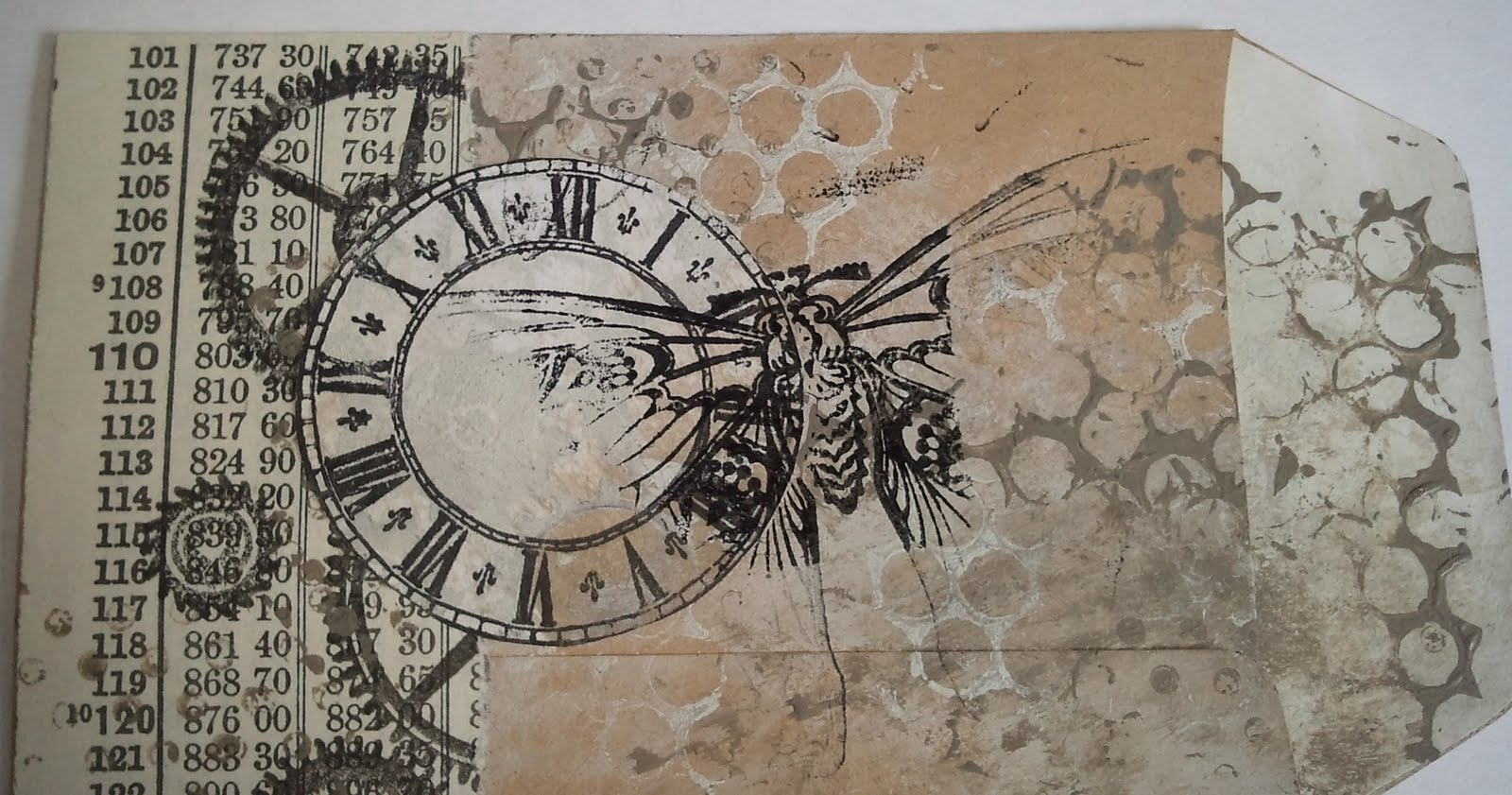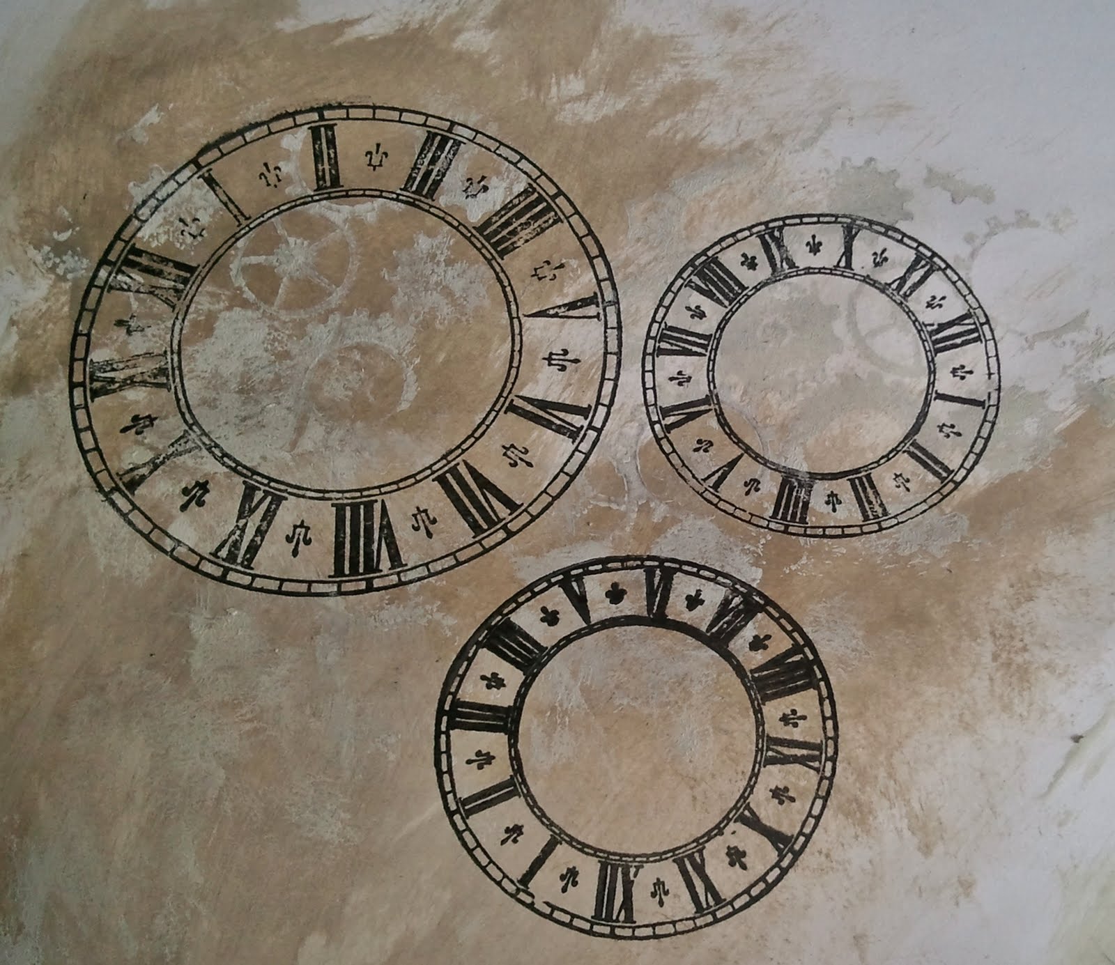 I painted the background using emulsion paint, masking some areas with Tim Holtz' cogs mask, and adding stamped elements with my Rusty Hinge distress ink pad and the wonderful cogs background alongside elements from Tick Tock.