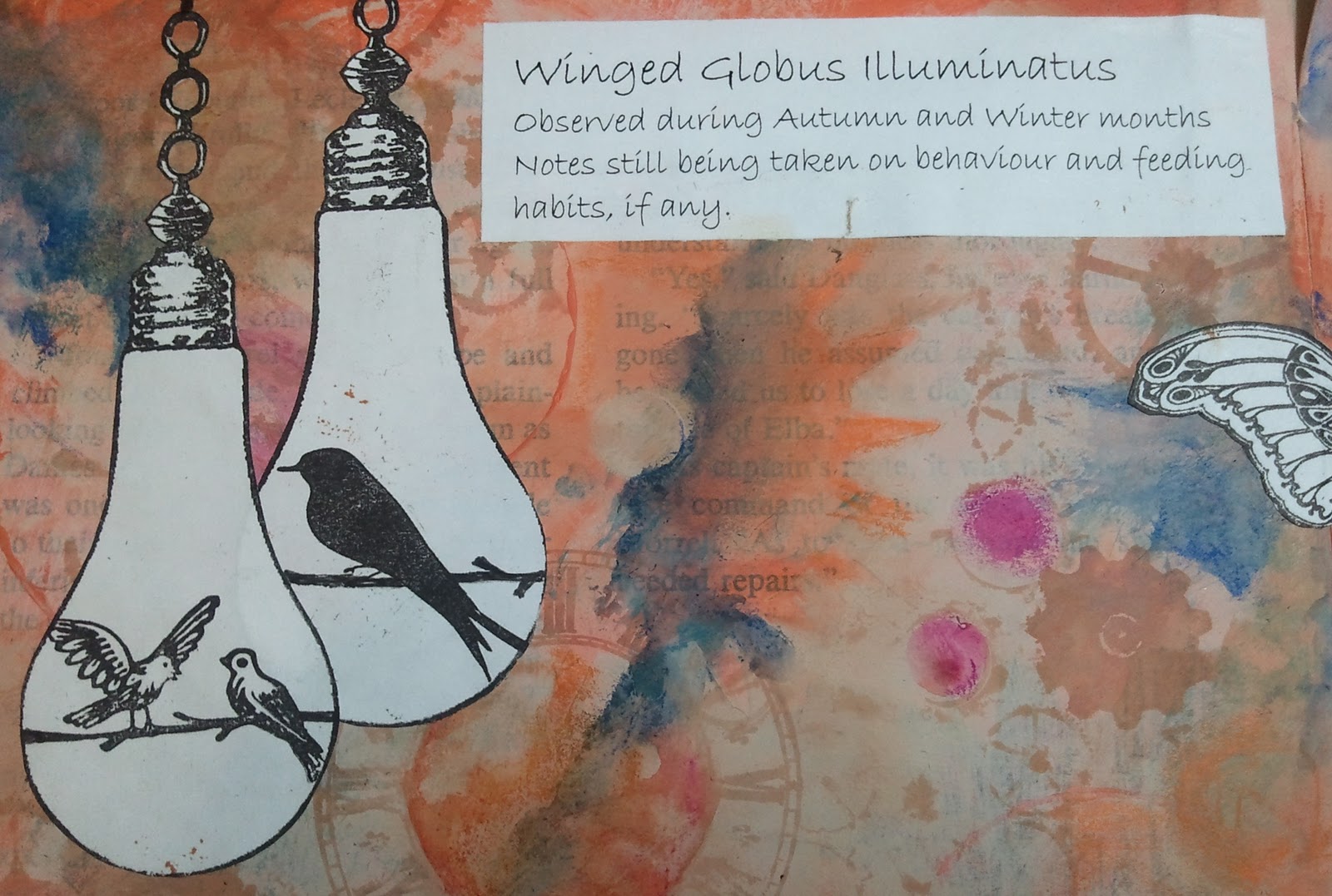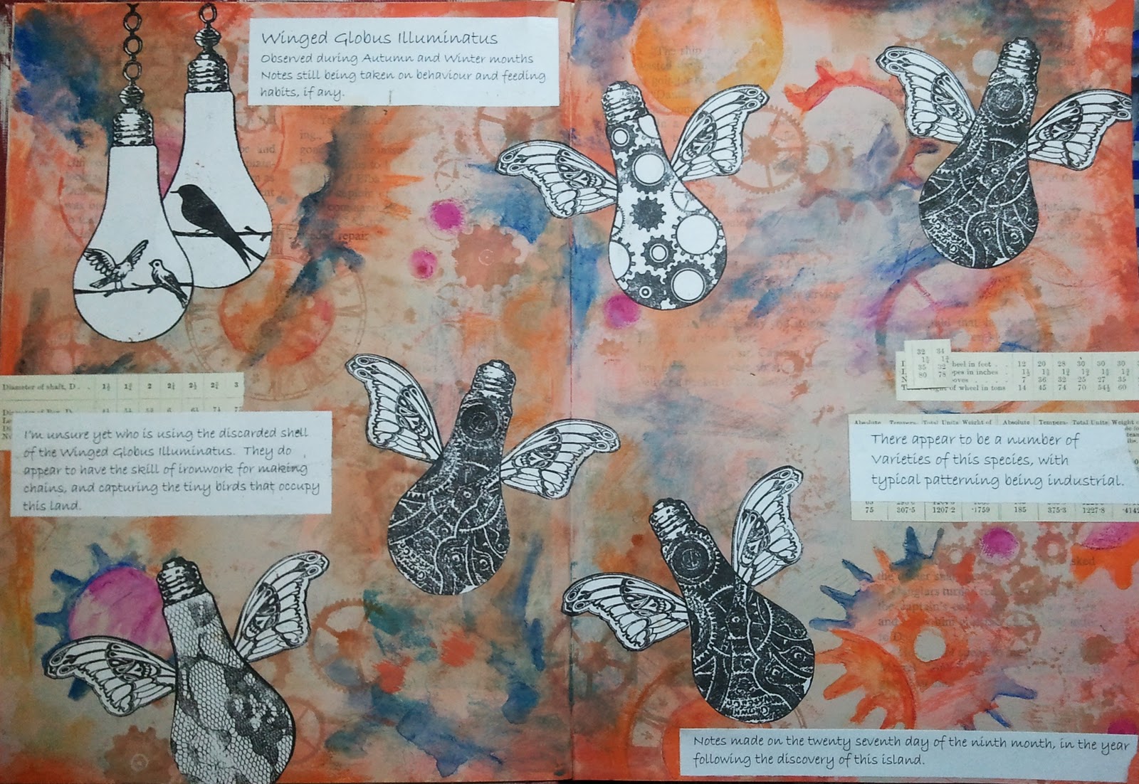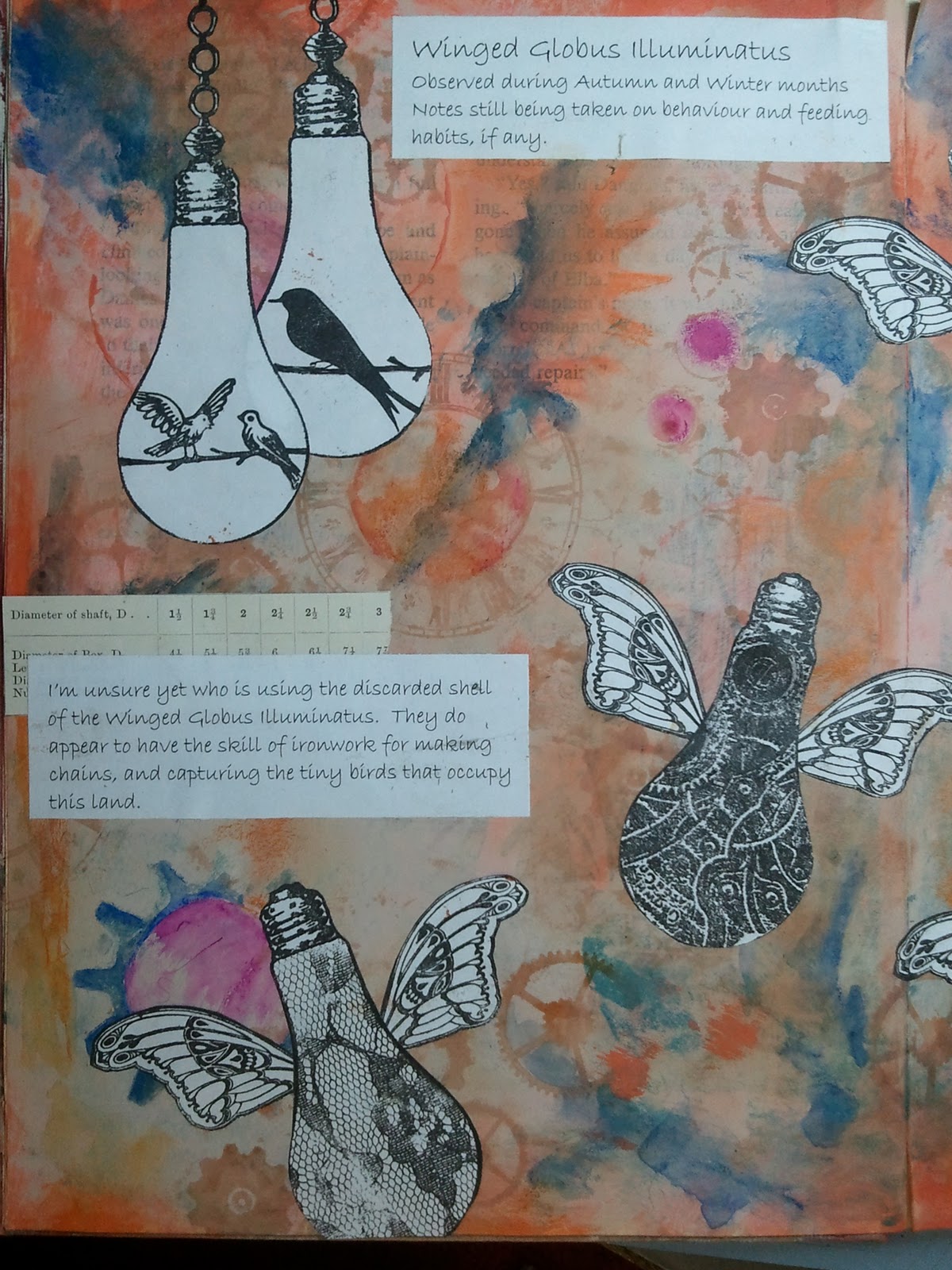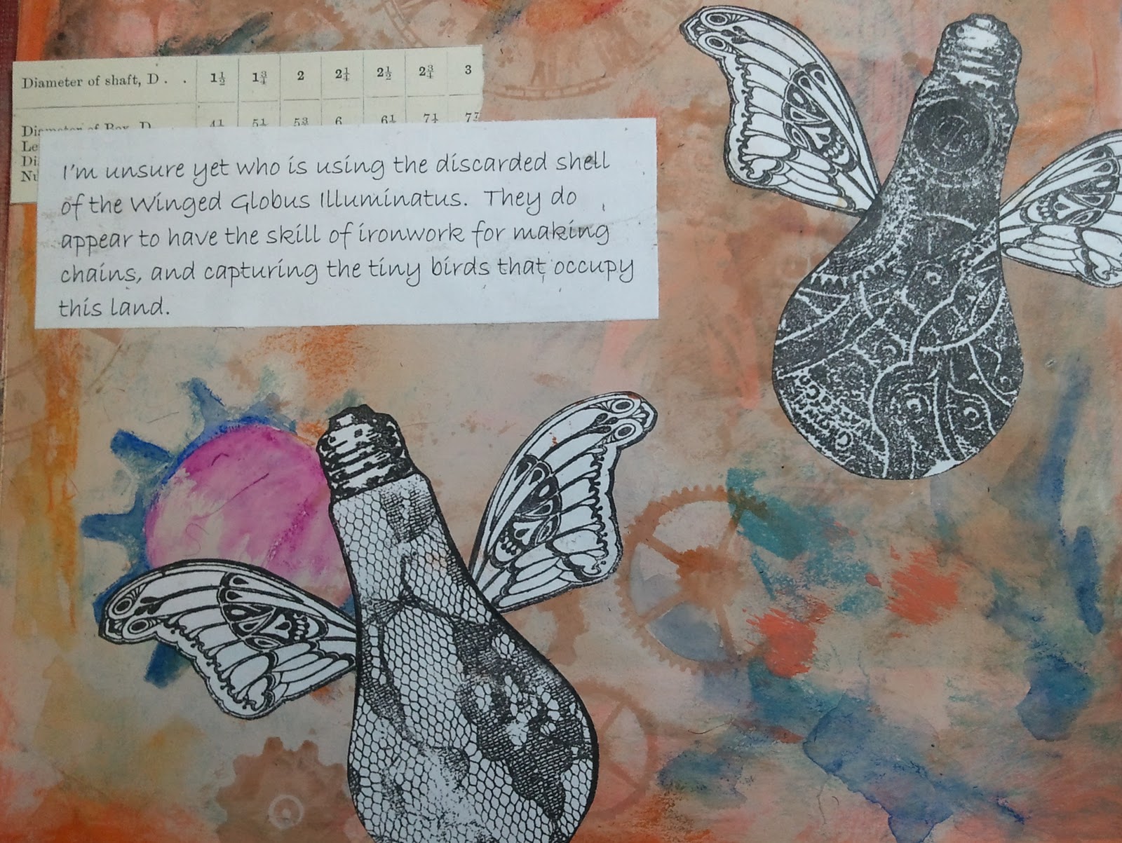 I think there's more to play with with this story of winged light bulbs fluttering through the air, and strange creatures using their discarded shells to keep tiny birds in. And that's the fun of journaling, coming up with stories as you play.