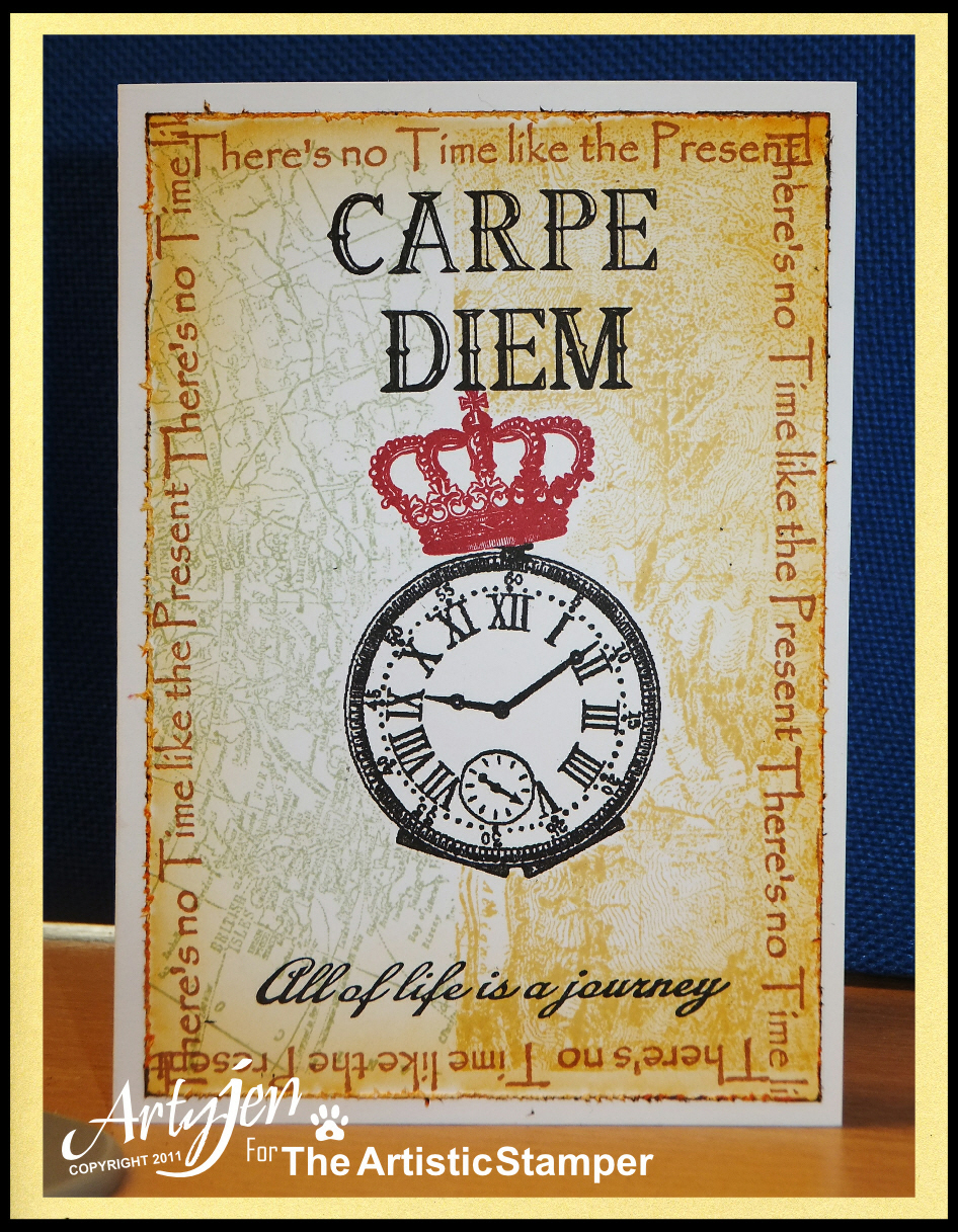 3. Stamp the sentiment "There's no time like the present" from Time and Keys in Archival sepia all around the edges.