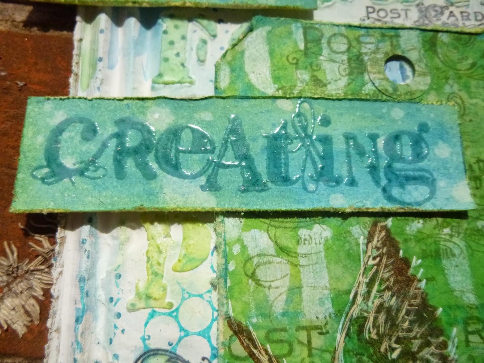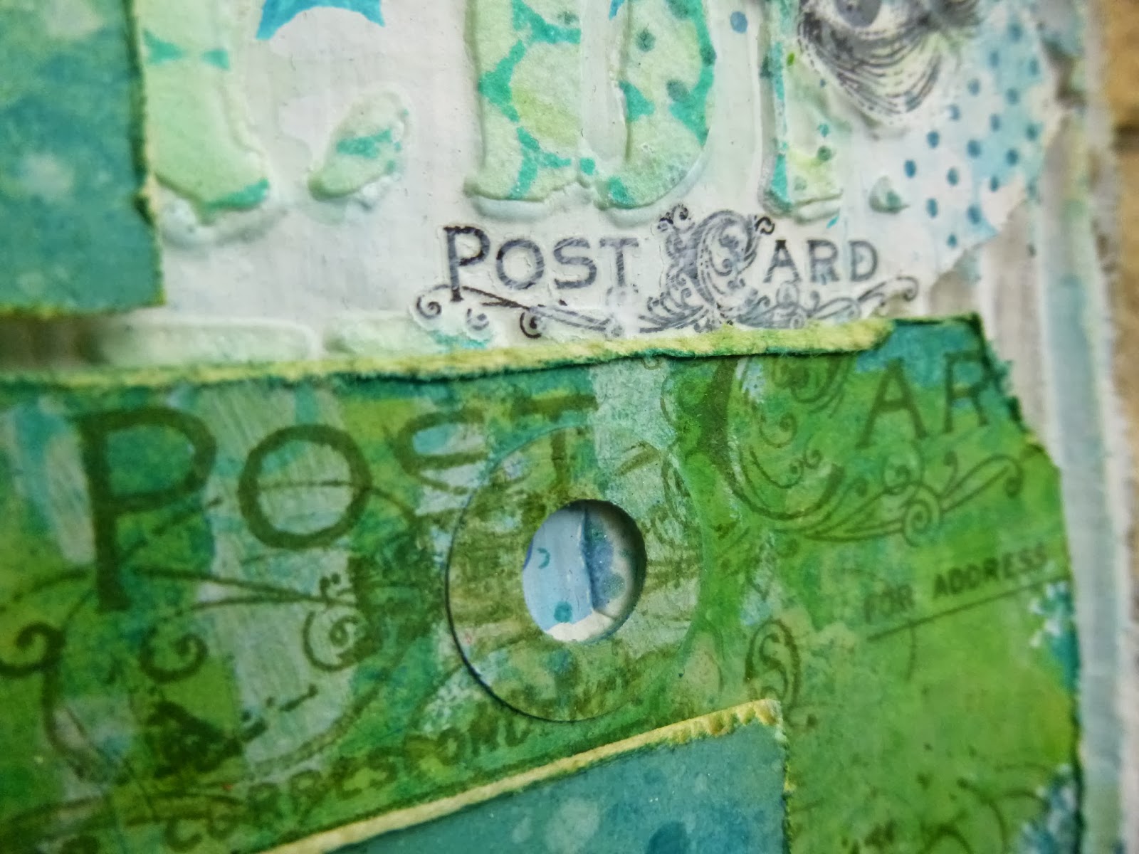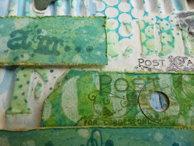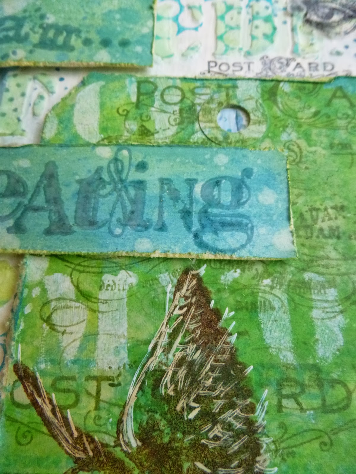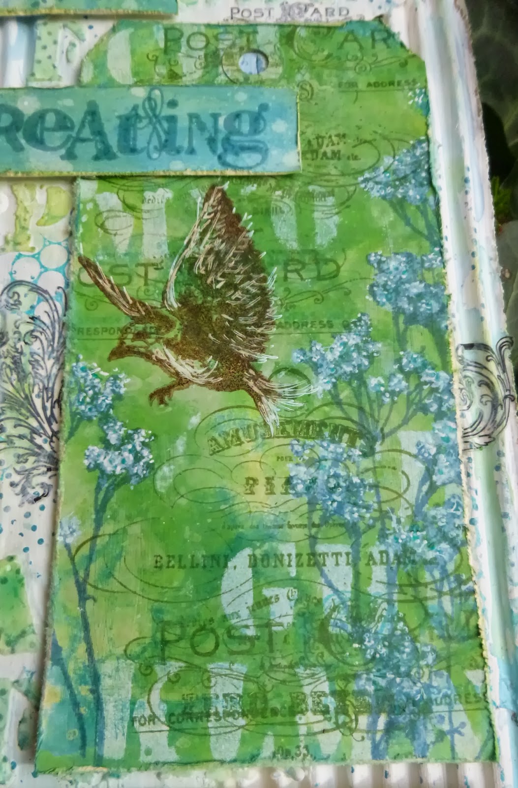 I added some Tim Holtz Remnant Rubs, matching the Postcard to the Postcard stamp on the tag...