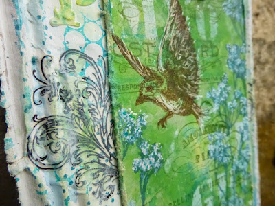 I started with the tag, doing a Distress Paint and Distress Stain combination with the wrinkle-free distress technique. You get lovely swirls of combined opacity and translucence - solid paint colours and glowing inks - and all in my favourite blues and greens. I then used some Broken China and Peacock Feathers Distress Inks to ink over the top, and then spritz and flicked with water to add extra texture to the layers of colour.