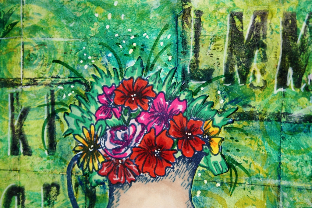 When cutting the card for the cover, I cut the card a little larger than the pages and with a spine section in the middle. I then inked the cover following the same process as the pages, except for when it came to stamping. This time I stamped in a contrasting coloured ink and I stamped along the spine, I also added some more stamping using black ink. After gluing the pages into the book I cut a small band to hold the book closed and add interest.