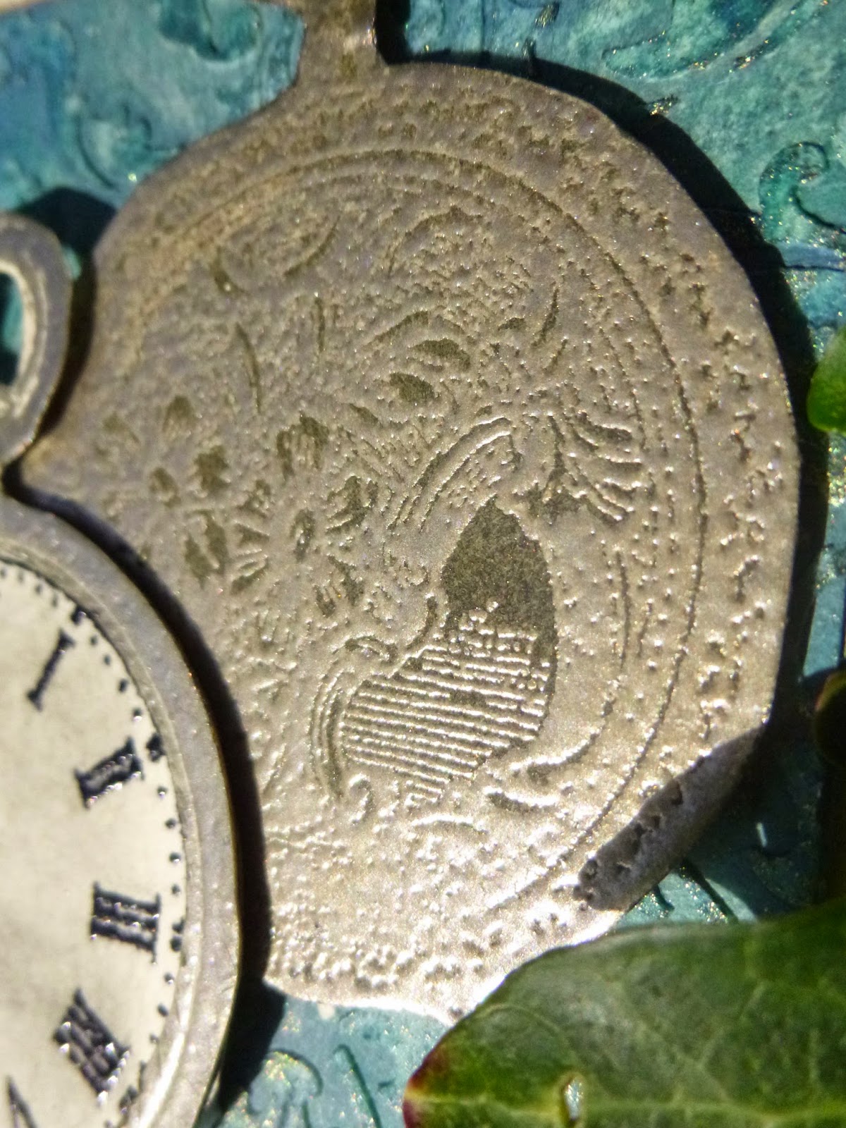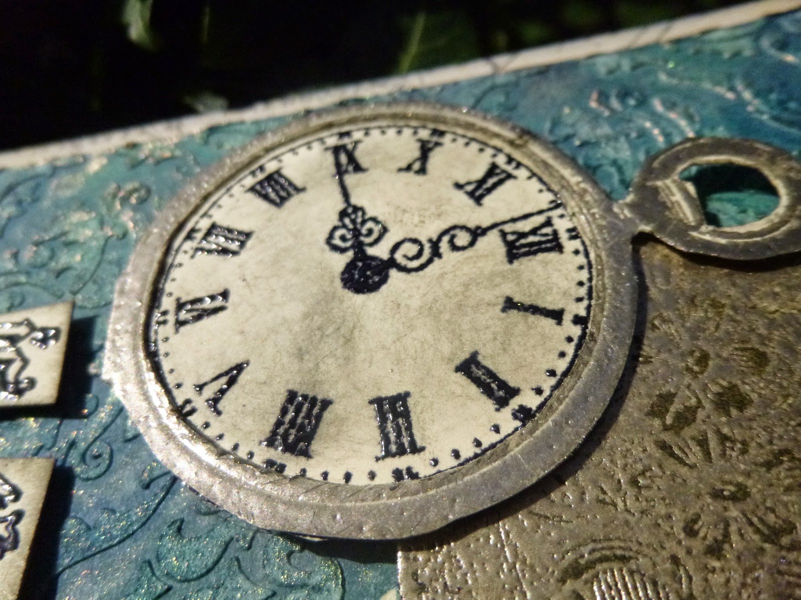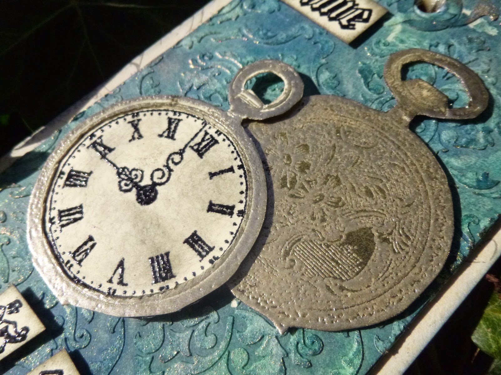 I had great fun with my metal pieces. The Idea-ology flower is altered with Distress Paint, while the skeleton leaves have had a dose of my Ten Seconds Verday Paint (weathered patinas, until now only really used on dollshouse work).