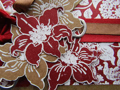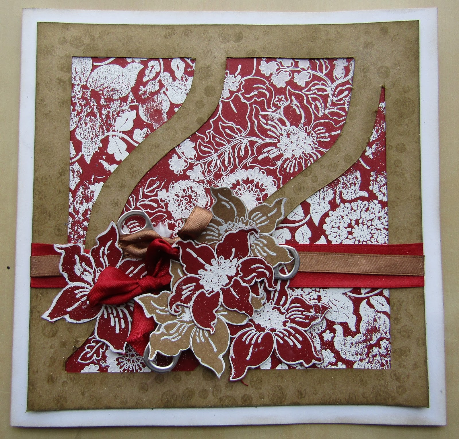 2- I then stamped one of the new designs by Tracy Scott over part of the card. I heat embossed this with a clear embossing powder.