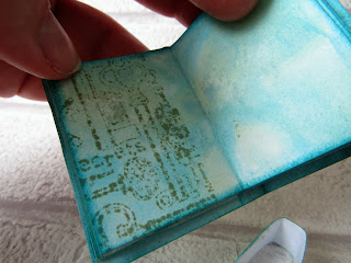 I cut the white card down to 3x2 inch rectangles for my pages and folded these in half. I then pushed them into Distress ink that I had spread onto my glass mat and sprayed with water.