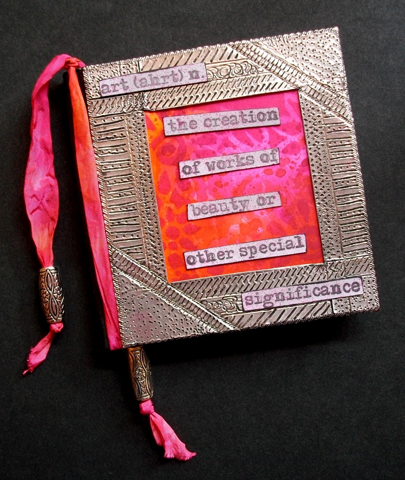 When cutting the card for the cover, I cut the card a little larger than the pages and with a spine section in the middle. I then inked the cover following the same process as the pages, except for when it came to stamping. This time I stamped in a contrasting coloured ink and I stamped along the spine, I also added some more stamping using black ink. After gluing the pages into the book I cut a small band to hold the book closed and add interest.