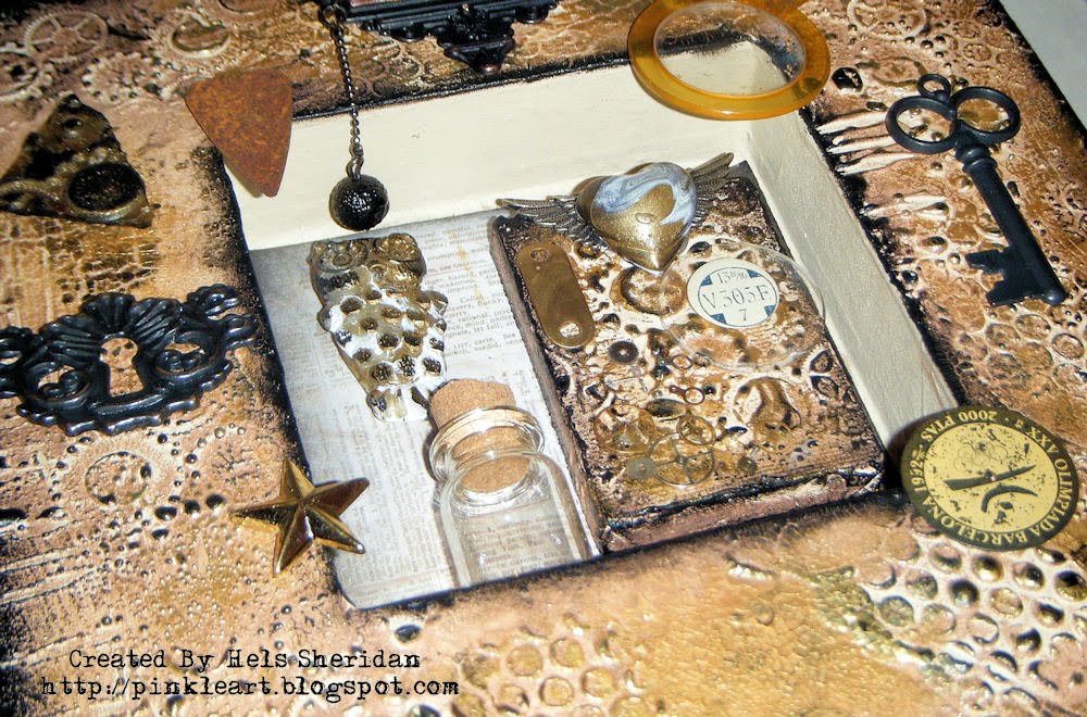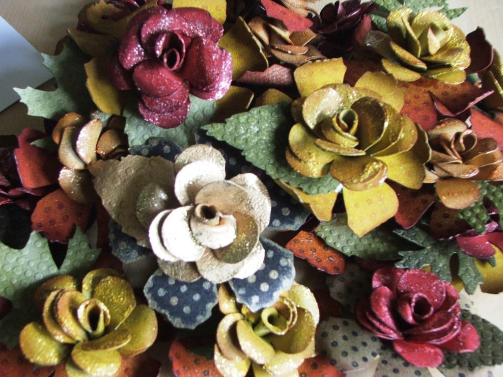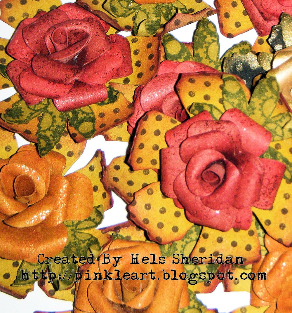 The big flower was stamped onto metal, refined and aged and then turned into a fivepetal flower... I then made a rose using metal and the small flower to sit in the middle with a leaf behind it. The butterfly is made from Dijon metal ..