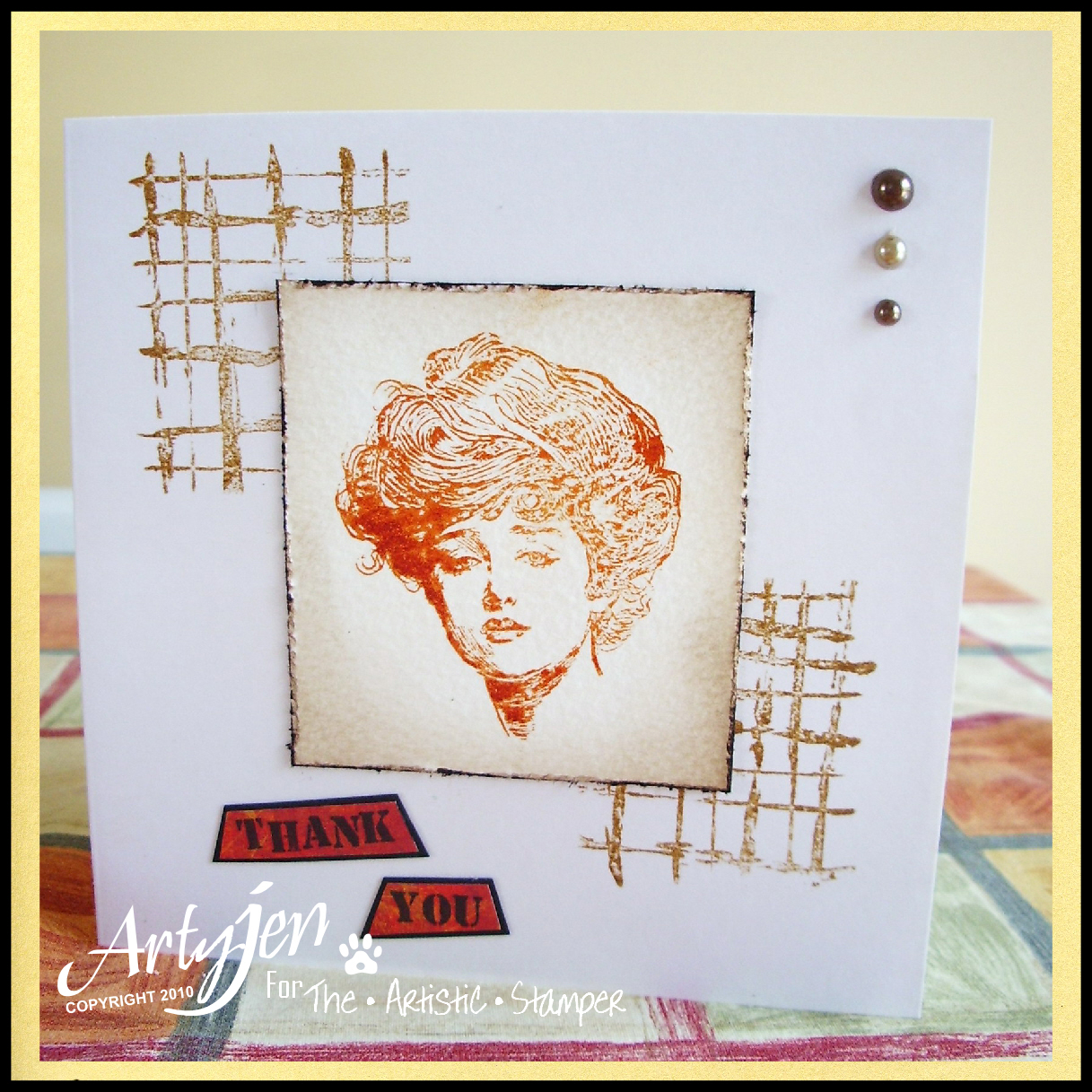 6. Make the background on the card by brushing Adirondack Dimensional Pearls in Butterscotch and Terracotta with a dry brush using a very loose motion in various directions until you have covered the card to your liking :)