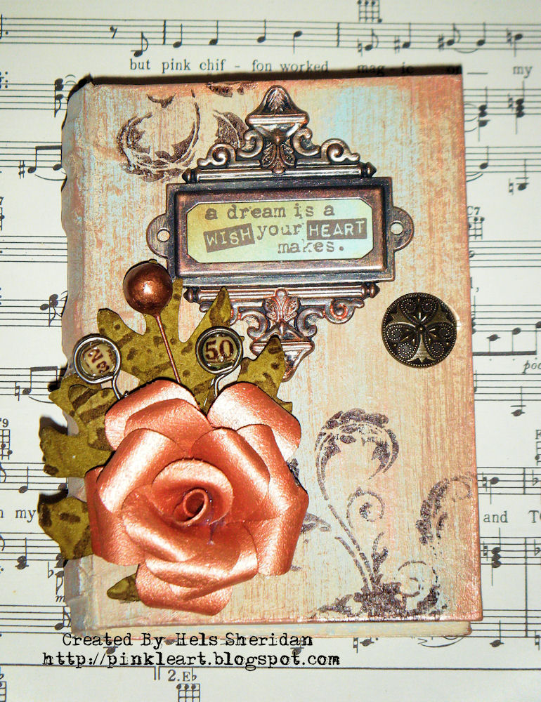 So, for my entry I have used a little papier mache book - any kind of papier mache item will work with this technique though. I painted a layer of watered down Traditional Tan paint and dried it quickly with a heat gun. Then I added some Cloudy Blue Dabber - again watered down slightly and applied with a paint brush... and dried again - finally a stipple brush of Sable Brown paint... dragged over the surface to make it patchy... and then a dab of Copper Dabber... again dried immediately. I have found to my cost - leaving the painted surface to dry naturally warps and buckles the papier mache... and normal thickness paint bubbles too much under the heat - hence the watered down versions :O)) I made a little card insert for the inside... colouring with DI's and stamping with Tim Holtz collection stamps.