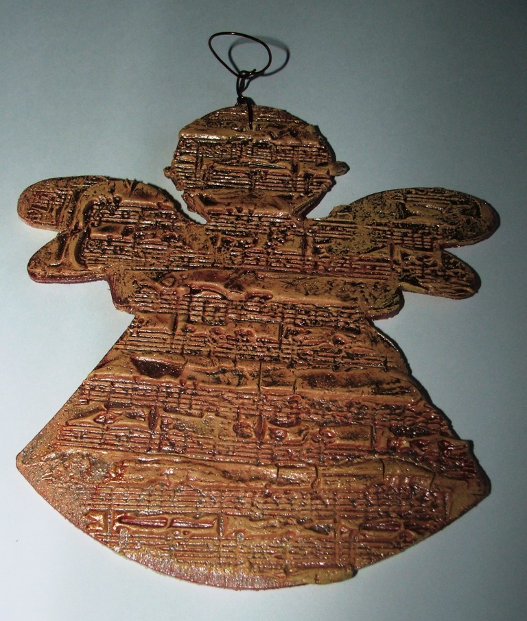 Every month, we have a challenge set by one of the Team, and this month the subject is "Something Hidden " set by Tina. I had lots of ideas for it, but came up with this idea while prepping a workshop for Christmas cards. The wooden angels are great blank canvases, and I used Terra which I smooched all over it and stamped into with a wet stamp. I used the music background, and then immediately washed the stamp clean. If you don't your stamp will harden and be ruined!