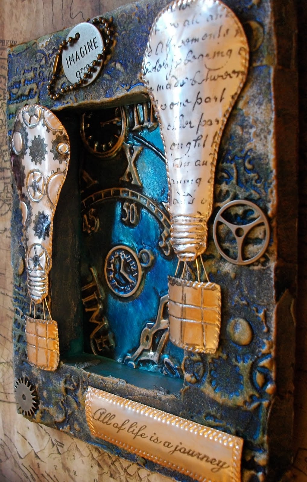 3. Back to the Shadowbox. Once it is dry, sponge Azure Precious Metal Paint all over it, including the cavity. Add highlights to the stamped areas with Silver PM Paint and Orange Inka Gold. Once the paint is dry,adhere the metal inlay into the cavity, using red line tape.