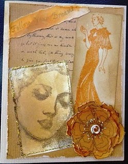 Copper Dabber... again dried immediately. I have found to my cost - leaving the painted surface to dry naturally warps and buckles the papier mache... and normal thickness paint bubbles too much under the heat - hence the watered down versions :O)) I made a little card insert for the inside... colouring with DI's and stamping with